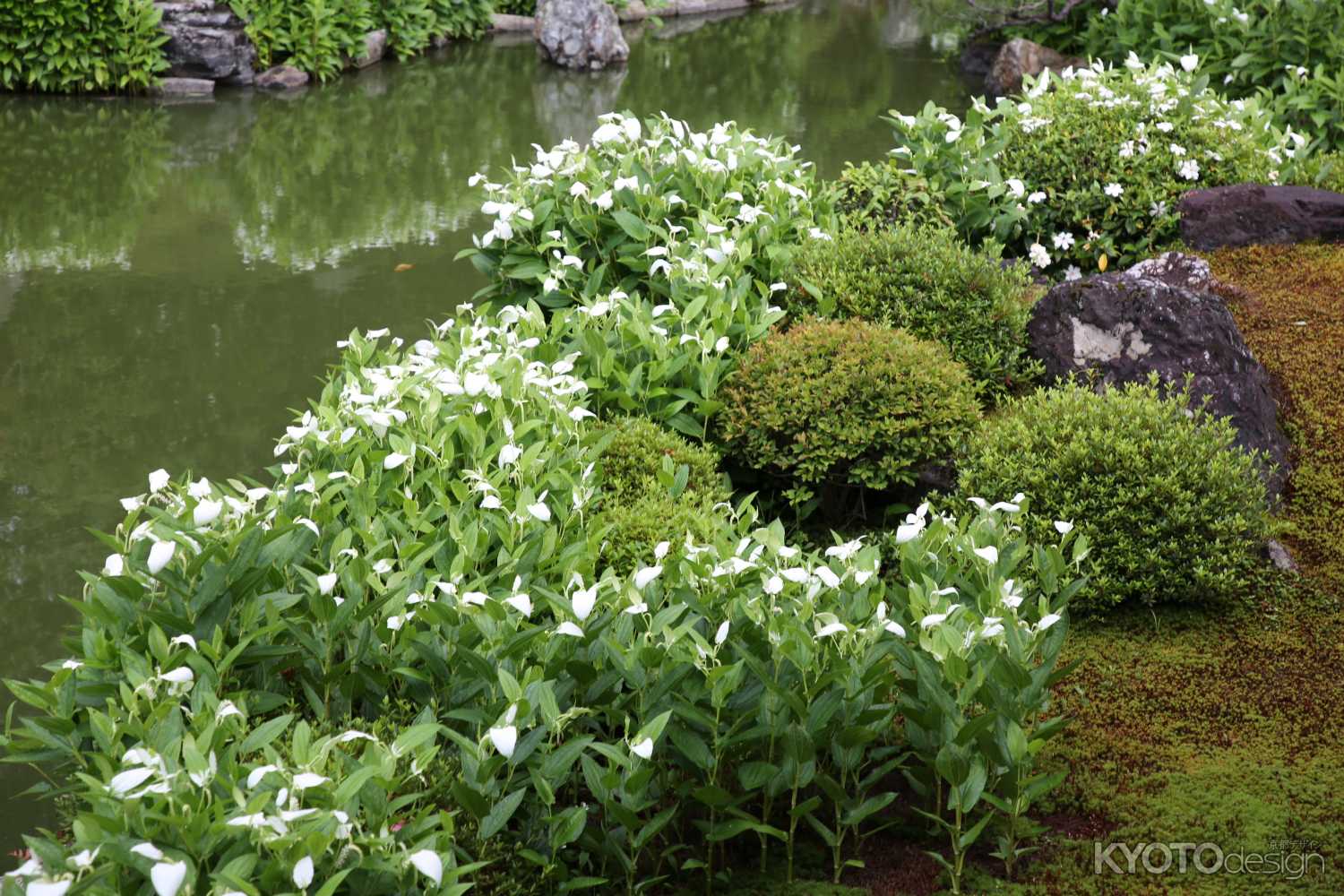 白砂と苔に青松が美しい唐門前庭、枯山水庭園の方丈前庭、そして京都府指定名勝庭園の池泉廻遊式庭園があり、初夏には池辺を彩る半夏生が見ごろを迎えます。