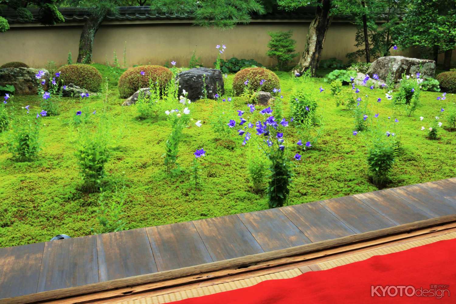 びっしりと杉苔に覆われた枯山水の庭に八重の桔梗が美しく咲きます。