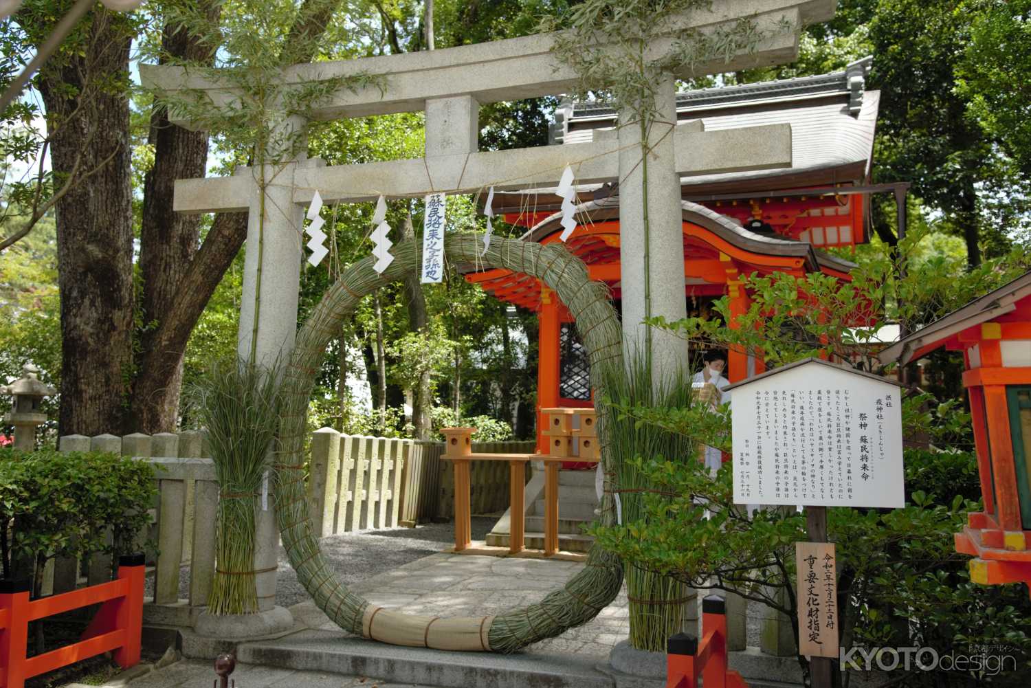 八坂神社の境内にある疫神社の鳥居に、高さ2メートルを超す大きな茅の輪がお目見えします。祇園祭の無事終了を感謝するとともに、茅の輪をくぐって「蘇民将来子孫也」の護符を授かるというのが、この神事です。参拝者は、茅の輪をくぐったあと、無病息災を願って茅(ちがや)を少し抜いて持ち帰ります。