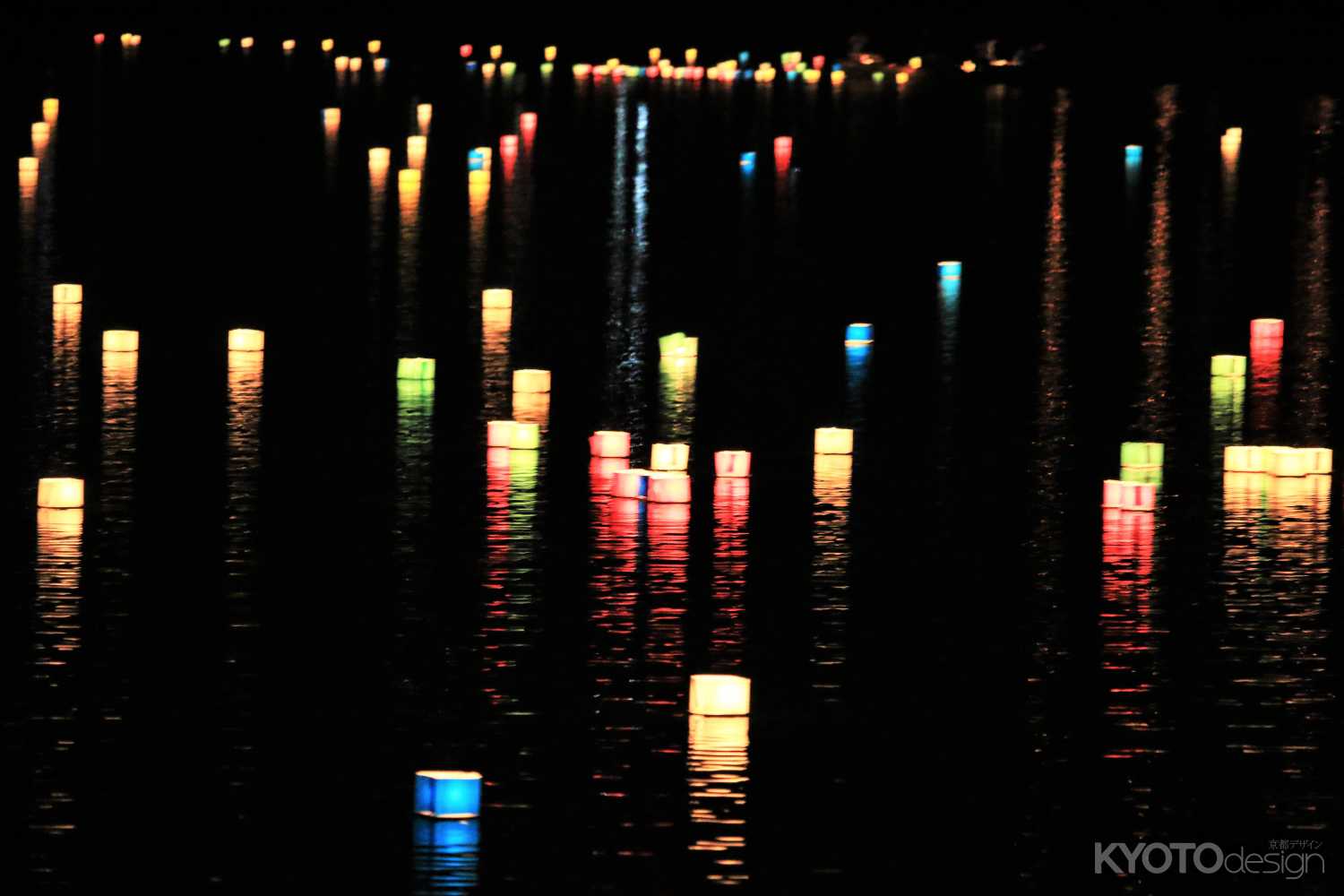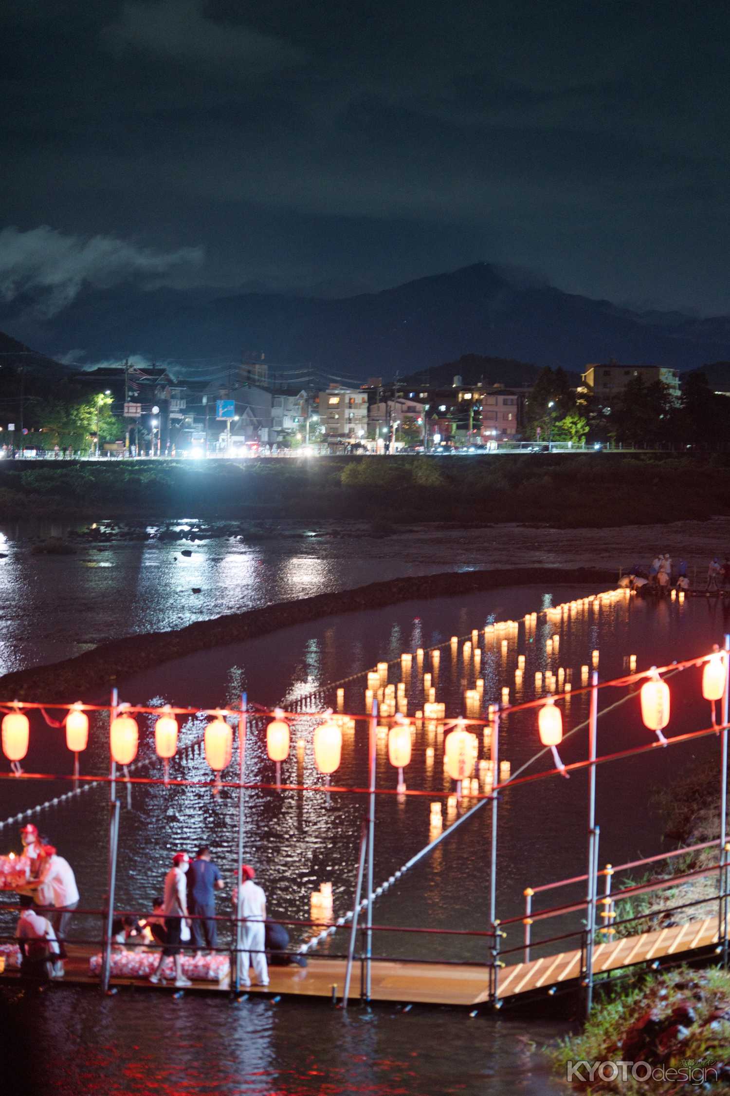 渡月橋の東詰より桂川に精霊送りの灯籠が流されます。