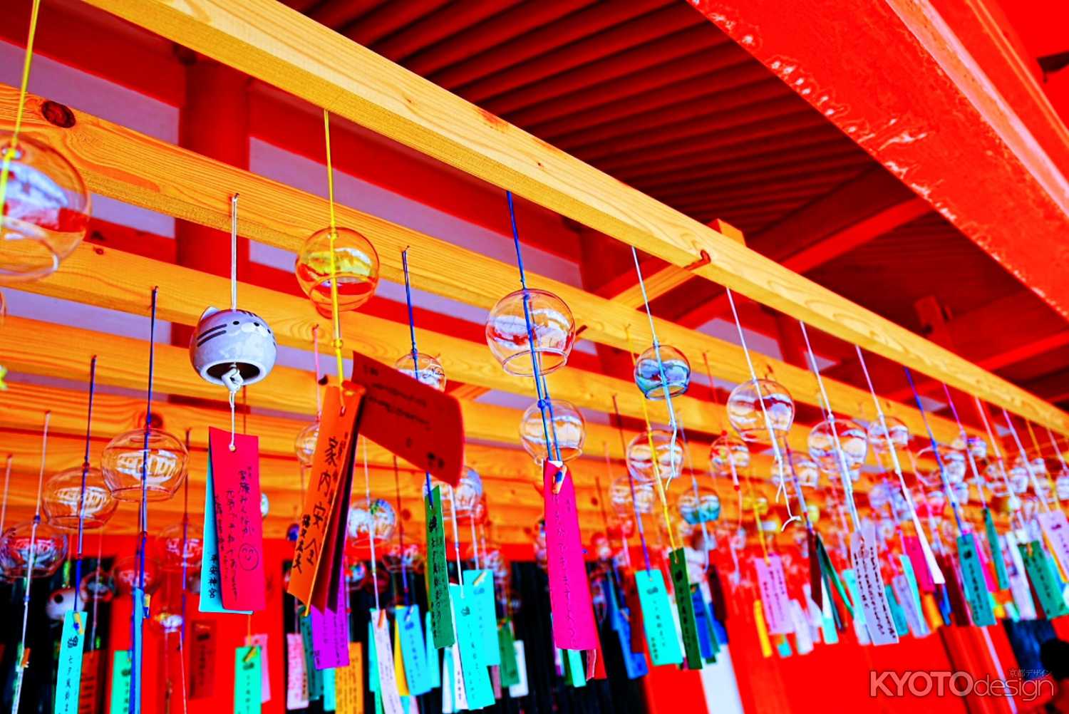 重要文化財に指定されている回廊と神苑(泰平閣)にて約1000個の風鈴が吊り下げられます。古来より風鈴の音色には魔除け・邪気除けの効果があるとされており、参拝者は色とりどりの短冊に願い事を記入し、好きな風鈴に付けて祈りを届けます。