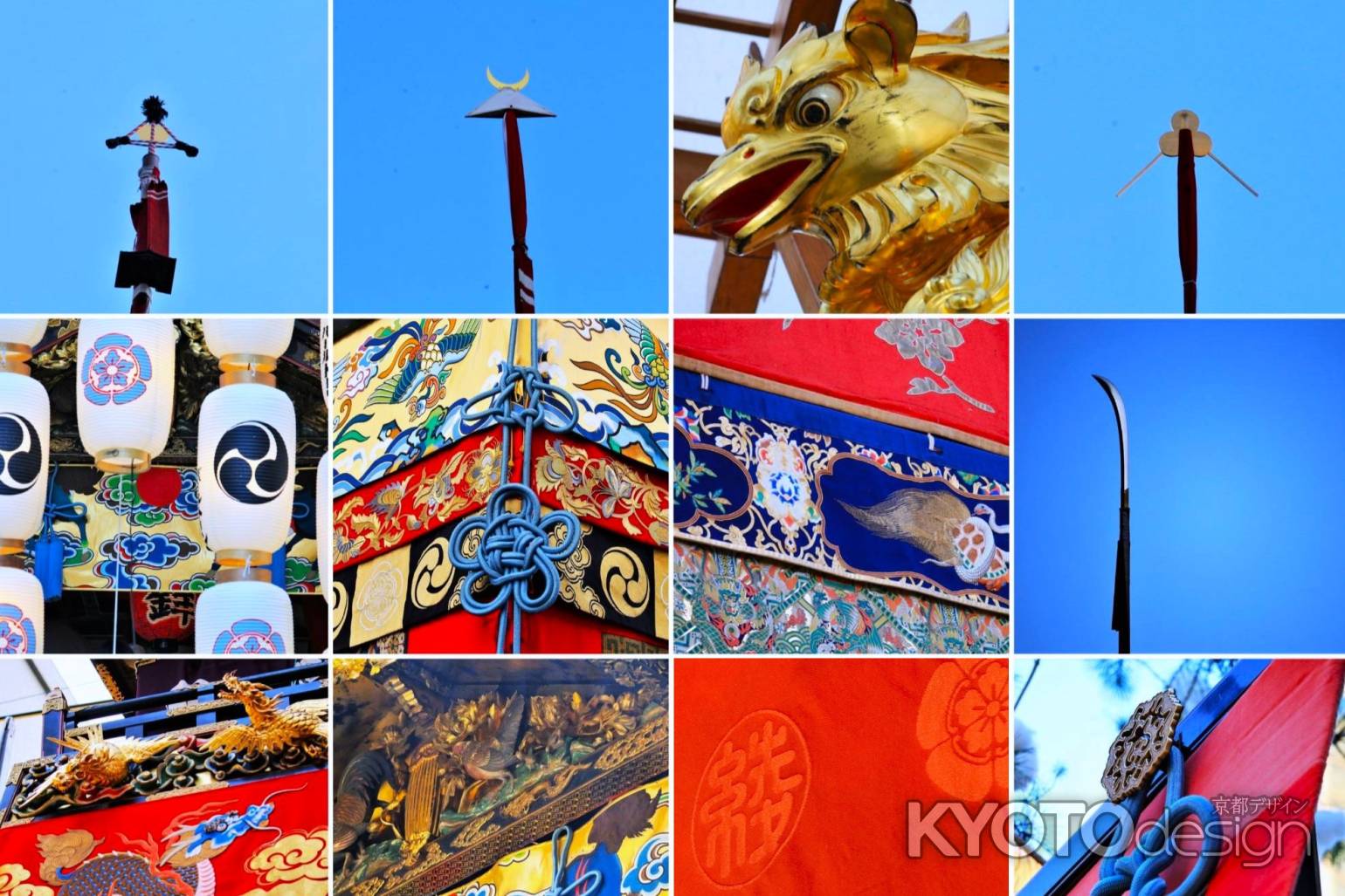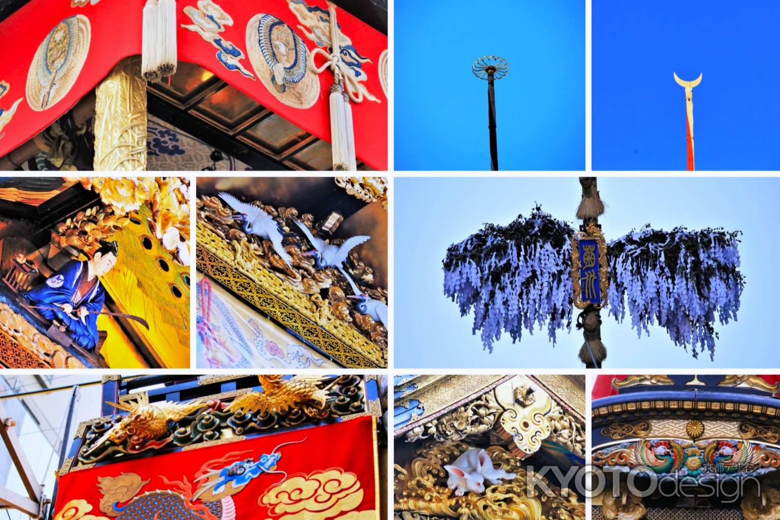 山鉾の豪華絢爛さ。美しい木工、金工、漆塗り、織物、刺繍、古今東西の名品。どの山鉾も、見飽きることなく眺めていられます。鉾立て、飾り立て、宵山、巡行、どんな場面もすばらしいです。前祭の山鉾について見どころをどうぞ。順番は、平成7年の前祭巡行順になっています。文の最後は、各山鉾のご利益です。