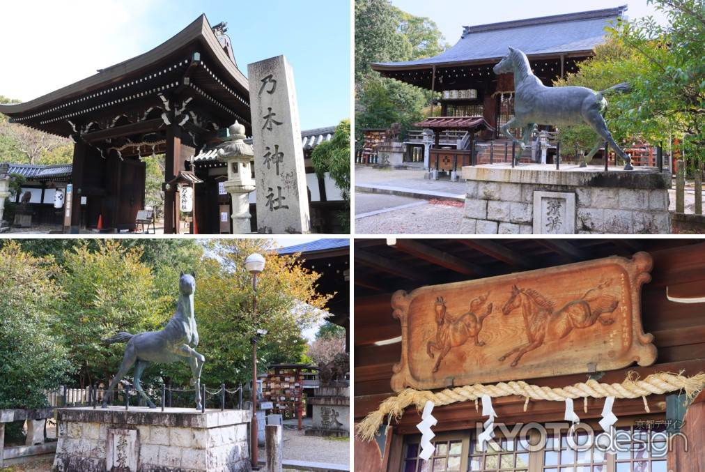伏見区横大路にあり競馬ファンが参拝する神社として知られ、拝殿前には境内にあった樹齢200年の大木から作られたという雌雄一対の馬の木像が安置されています。また絵馬は、「馬九行久」(=うまくいく)という文字と、九頭の馬の絵が描かれています。