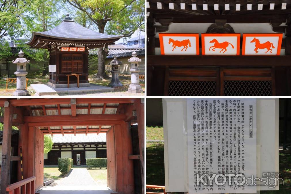 東寺灌頂院は、4月21日の「正御影供」の時に灌頂院の中にある「閼伽井」(あかい)と言う井戸を蓋うお堂の庇に三枚の絵馬が架けられる。その馬の絵でその年の天候や農作物の出来を占うそうである。