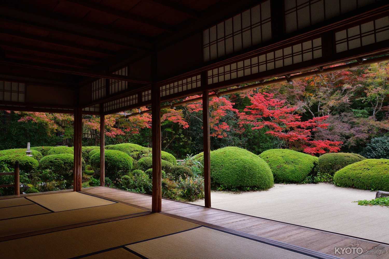 凹凸窠の詩仙の間から眺める初夏の庭は、白砂が敷きつめられた周囲の丸く刈り込まれたサツキと、遠景の楓の緑が独特の雰囲気を醸し出しています。この庭の魅力のひとつに、サツキの花が咲く季節と紅葉の季節では全く異なる姿(コントラスト)が楽しめることが挙げられます。さらに、廊下を含めて広間のどの場所から眺めるかによって庭の印象が変わります。四季を通じて参詣者の心を落ち着かせてくれるます。