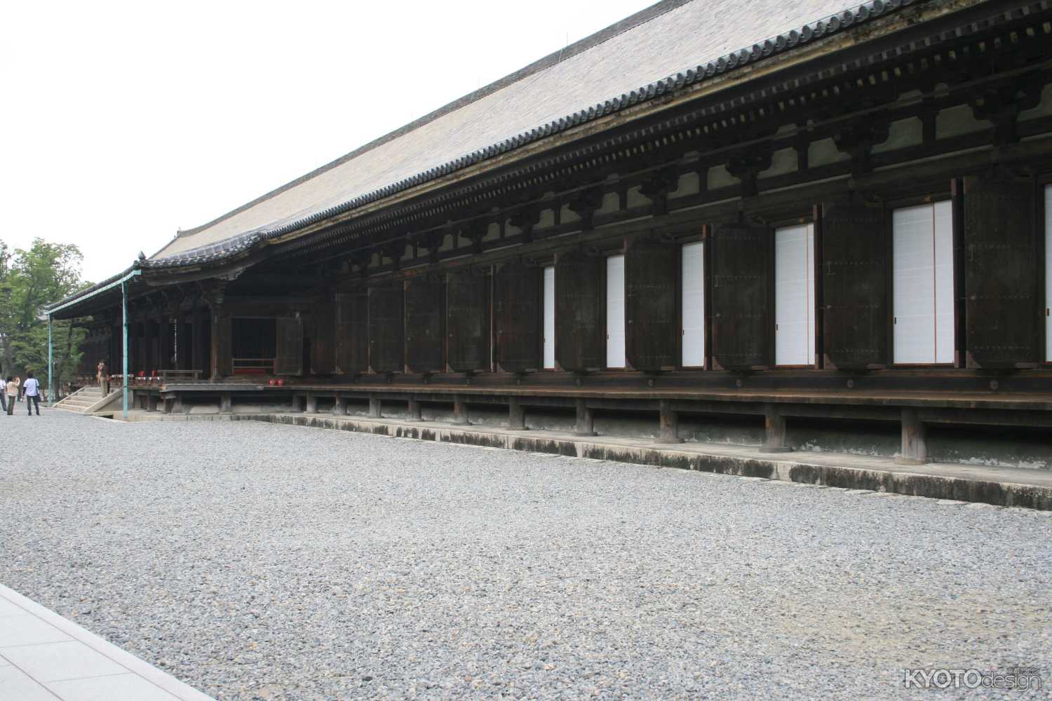 1164年(長寛2)鳥辺山麗(現、阿弥陀ヶ峯)の後白河上皇・院政庁「法住寺殿」の一画に平清盛が造進しました。約80年後に焼失してしまうのですが、すぐに1266年(文永3)に再建されました。その後、室町・桃山・江戸そして昭和と4度の大修理により700年間保存されています。長いお堂は和様の入母屋・本瓦葺きの「総檜造り」で約120m。正面の柱間が33あることから「三十三間堂」と呼ばれ、堂内には1001体もの観音像が祀られています。また見落としがちですが境内・南の通称「太閤塀」と呼ばれる築地塀と南大門は、ともに豊臣秀吉ゆかりの桃山期の気風にあふれた重文・建造物です。