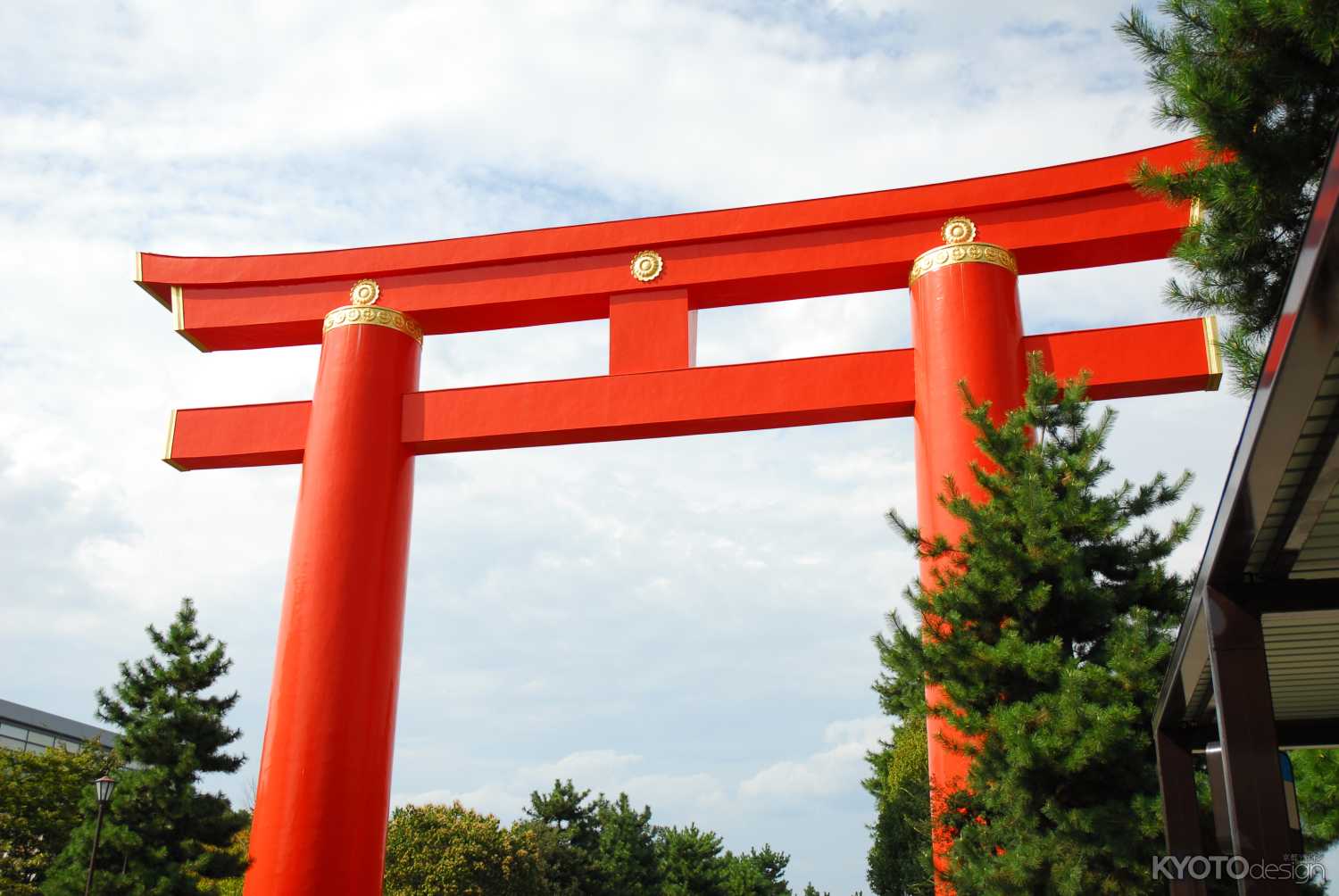 1895年(明治28)桓武天皇の平安遷都1100年祭を記念し垣武天皇を祭神として創建された神宮です。後に平安京最後の天皇である孝明天皇も合祀されました。社殿は平安京の政庁の中心であった朝堂院の形式を約二分の一に縮少して復元したものです。二層の神門は応天門中央正面一層の入母屋造の拝殿は大極殿、拝殿左右の桜閣は東は蒼龍桜、西は白虎桜と呼ばれています。