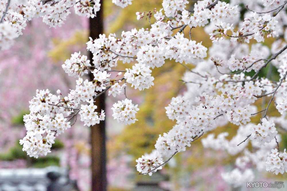 京都市内を焼き尽くした天明の大火(1788)で本堂などが焼失を逃れたことから、別名「焼けずの寺」とも呼ばれています。境内では染井吉野やしだれ桜が咲き乱れ、特に重文の本堂脇に咲く染井吉野は建物を覆い尽くさんばかりに咲き誇り、その光景は圧巻です。また、祖師道前には、その葉や皮を枕に敷くと子供の夜泣きが治るという言い伝えがある「夜泣き止めの松」もあり、これも見どころです。