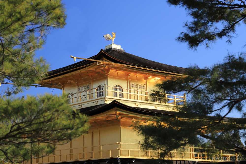 金色に美しく輝く舎利殿が有名な世界遺産、金閣寺。金閣の2層と3層は漆の上から純金の箔が張ってあり、屋根は椹の薄い板を何枚も重ねたこけら葺で、上には中国でめでたい鳥といわれる鳳凰が輝いています。また、金閣前の鏡湖池に映る「逆さ金閣」の美しさも見事です。