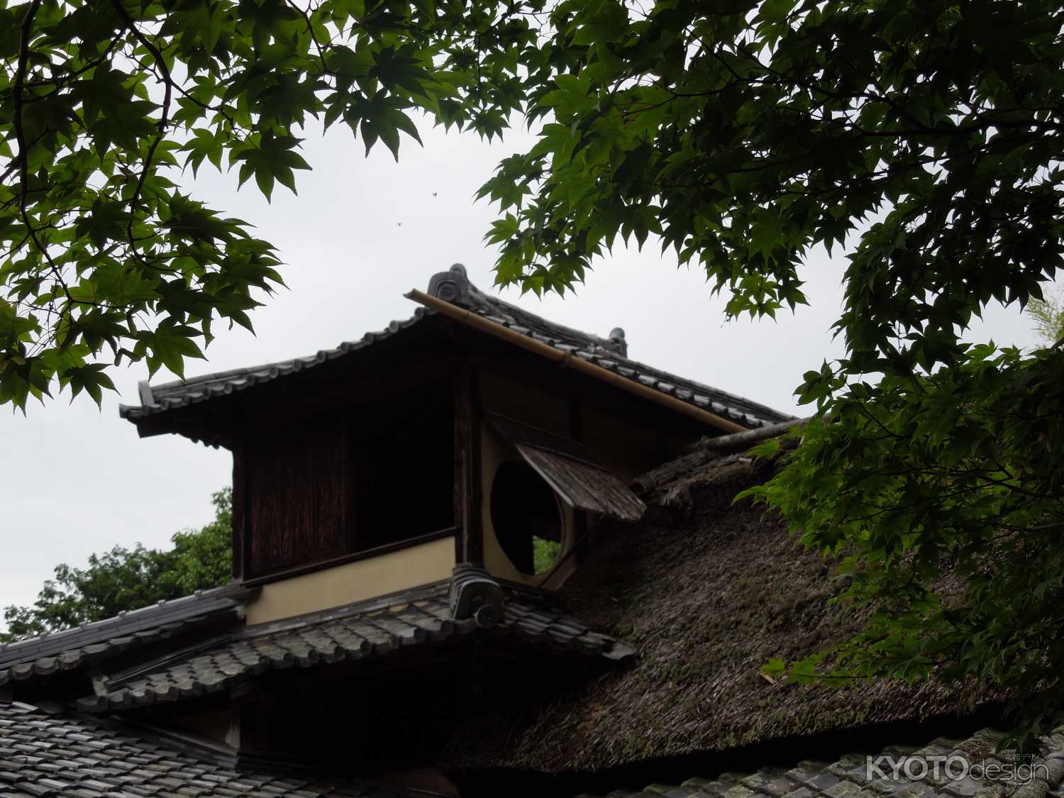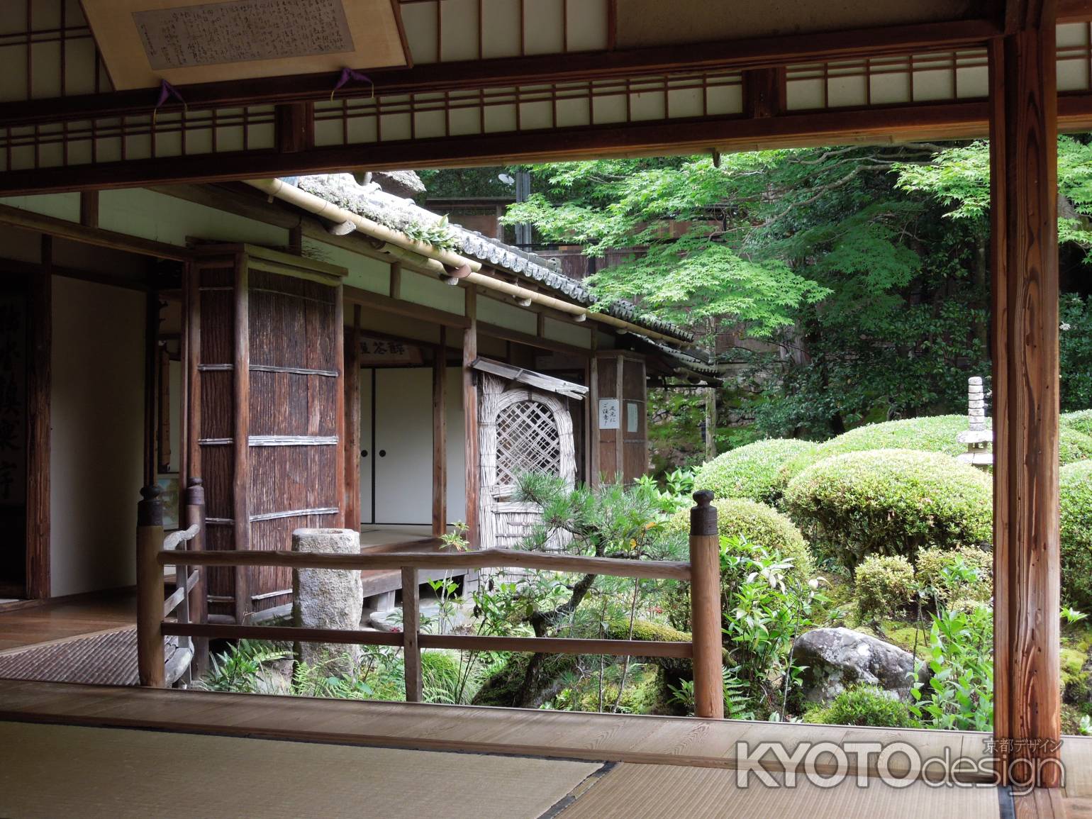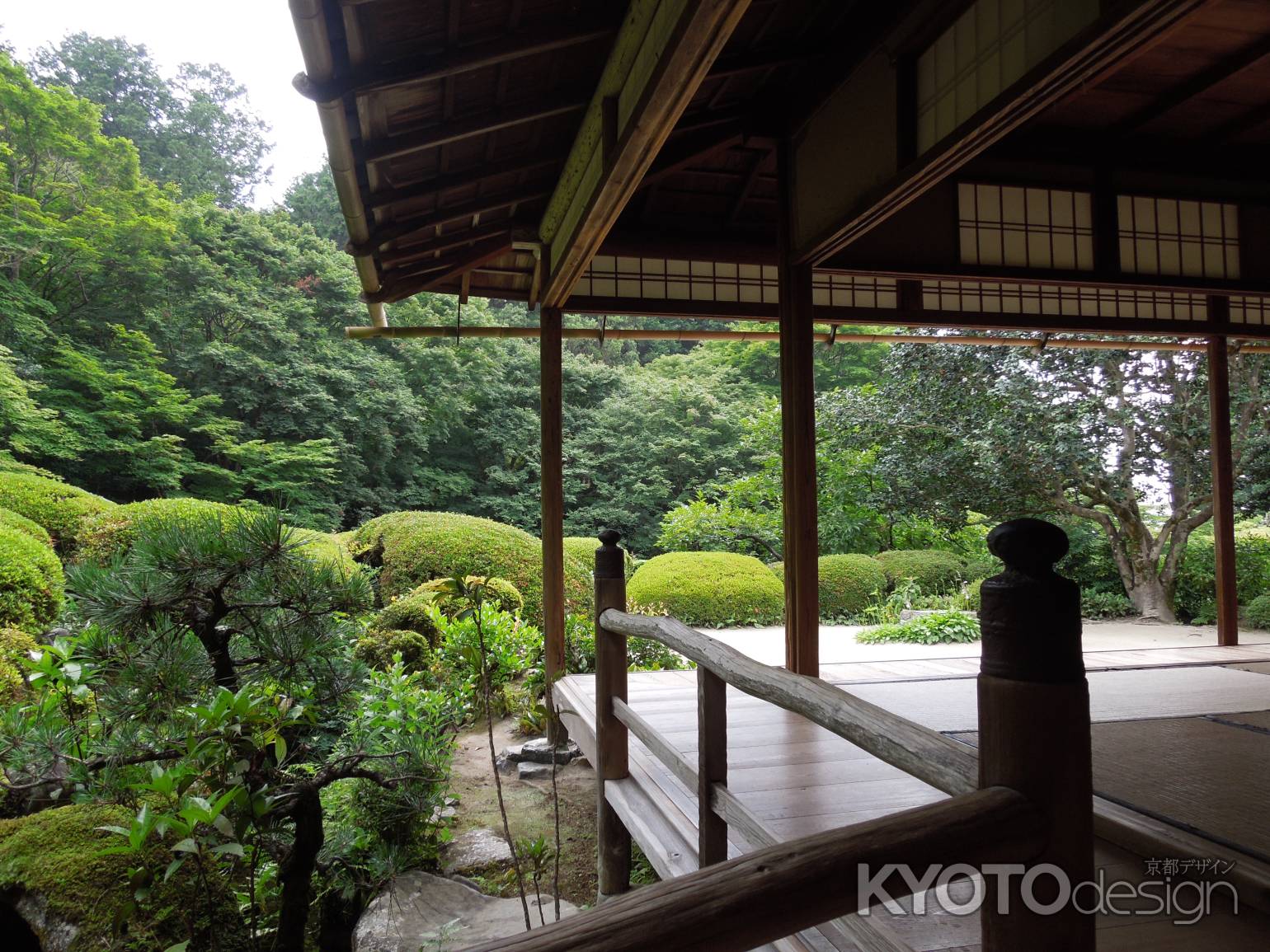 凹凸窠の詩仙の間から眺める初夏の庭は、白砂が敷きつめられた周囲の丸く刈り込まれたサツキと、遠景の楓の緑が独特の雰囲気を醸し出しています。