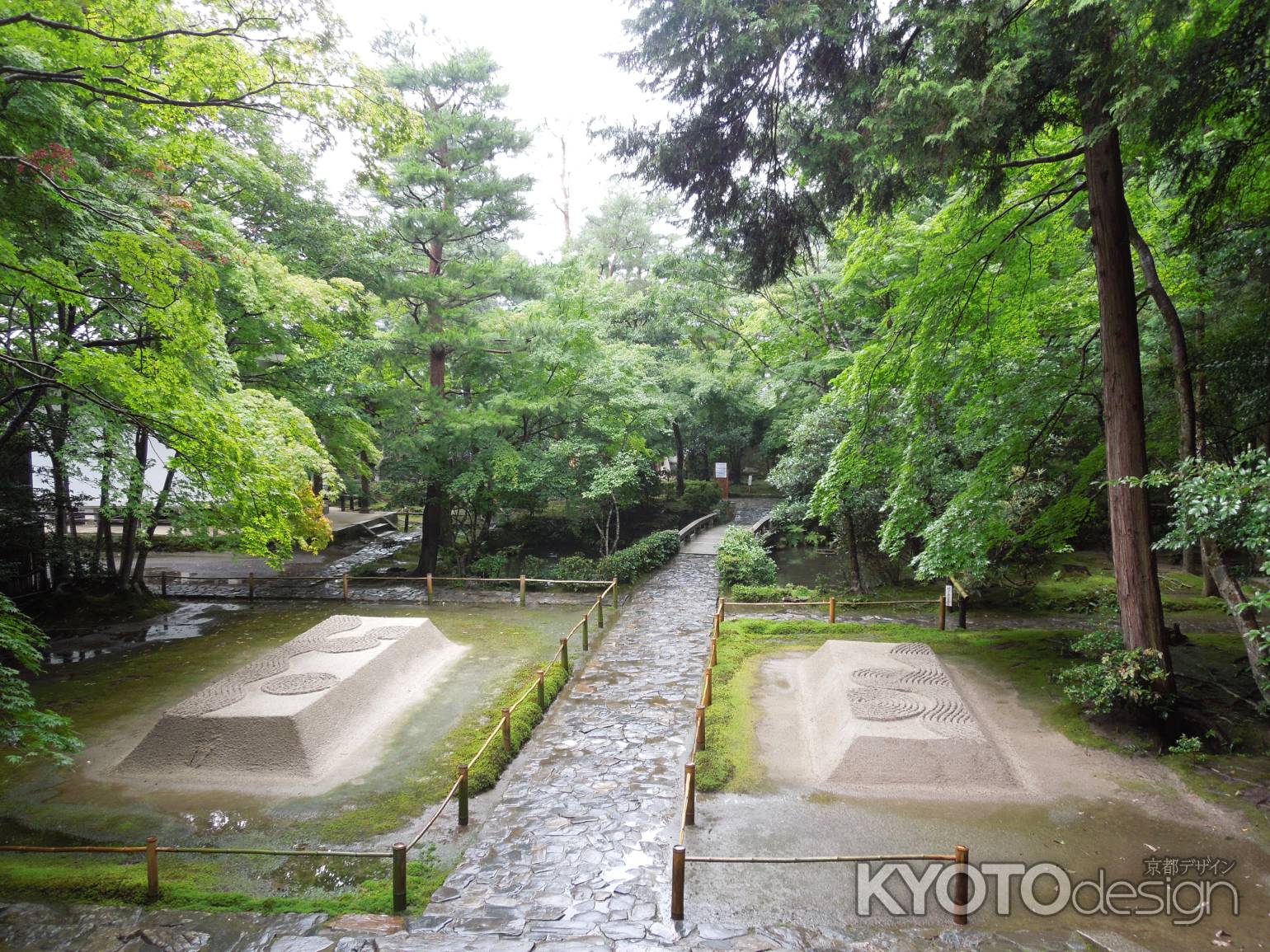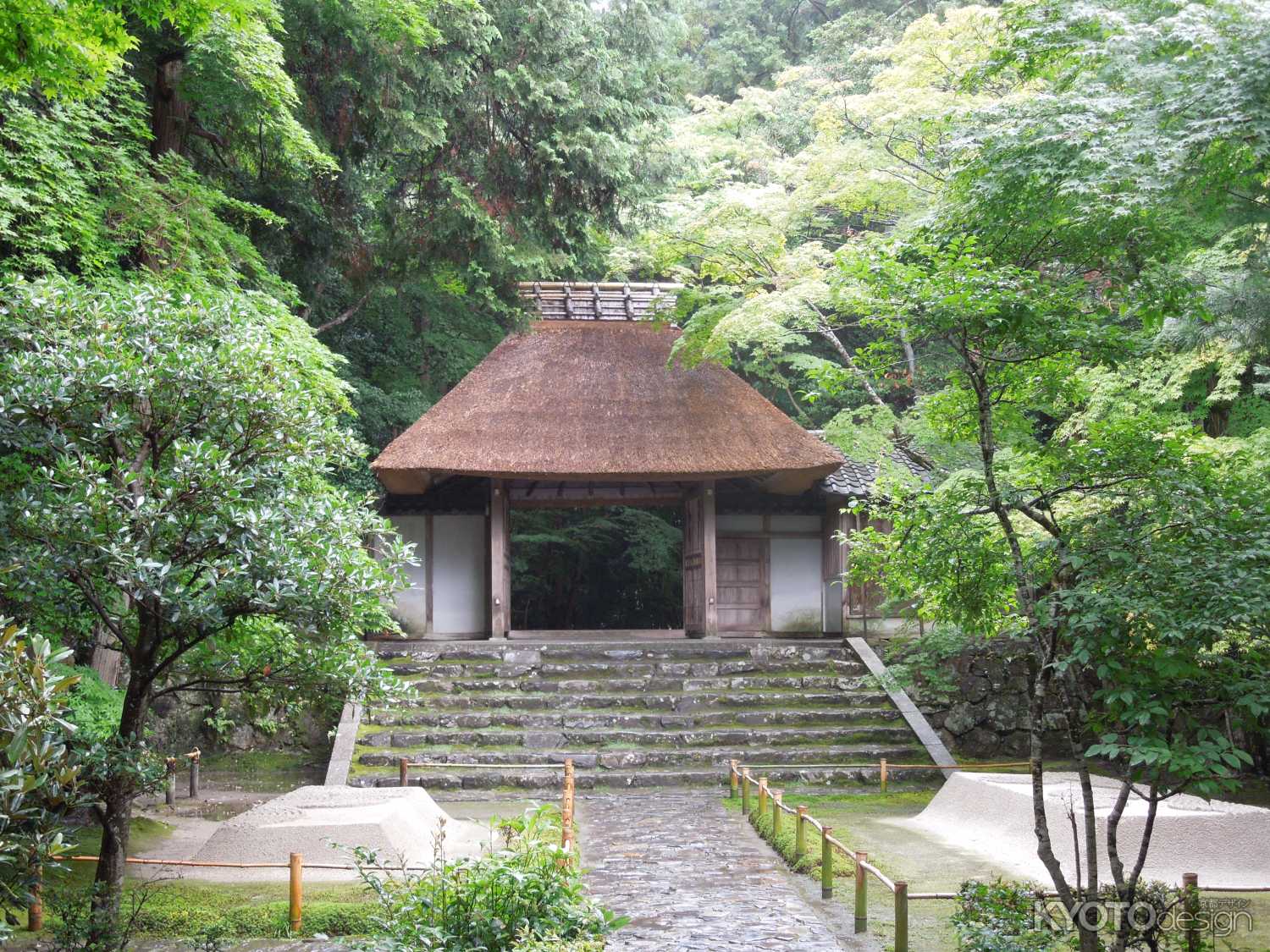 趣のある茅葺屋根の三門を抜けると、本堂へと続く参道の両側に白砂壇(びゃくさだん)という白い盛り砂があります。