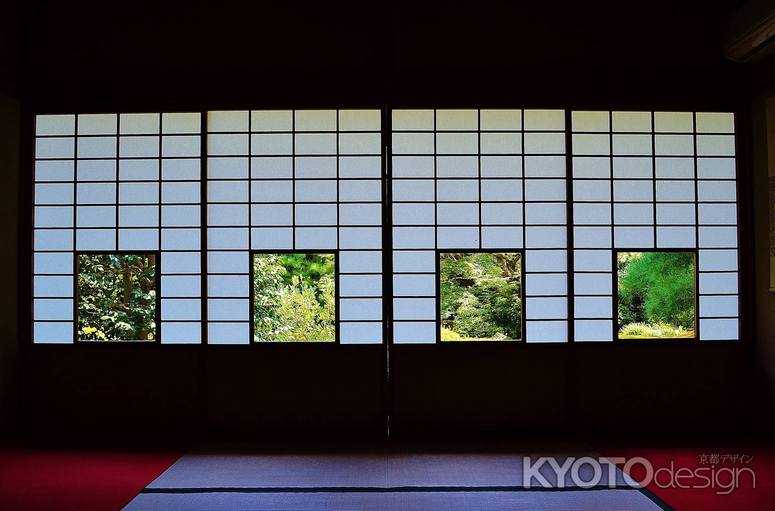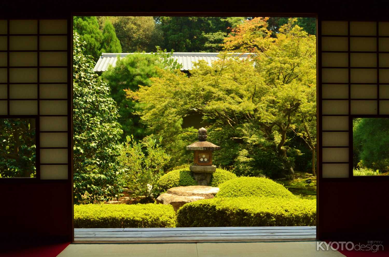 蓮華の間の雪見障子の四角のガラスから、椿・灯篭・楓・松のそれぞれ違った景色を見ることができます。