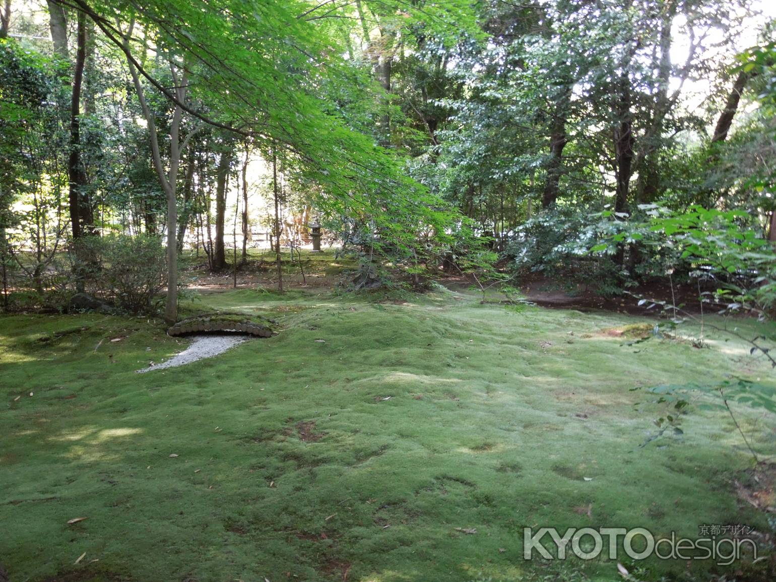 本殿に向かって右側には、緑の絨毯を敷きつめたような幻想的な苔の庭が広がっています。