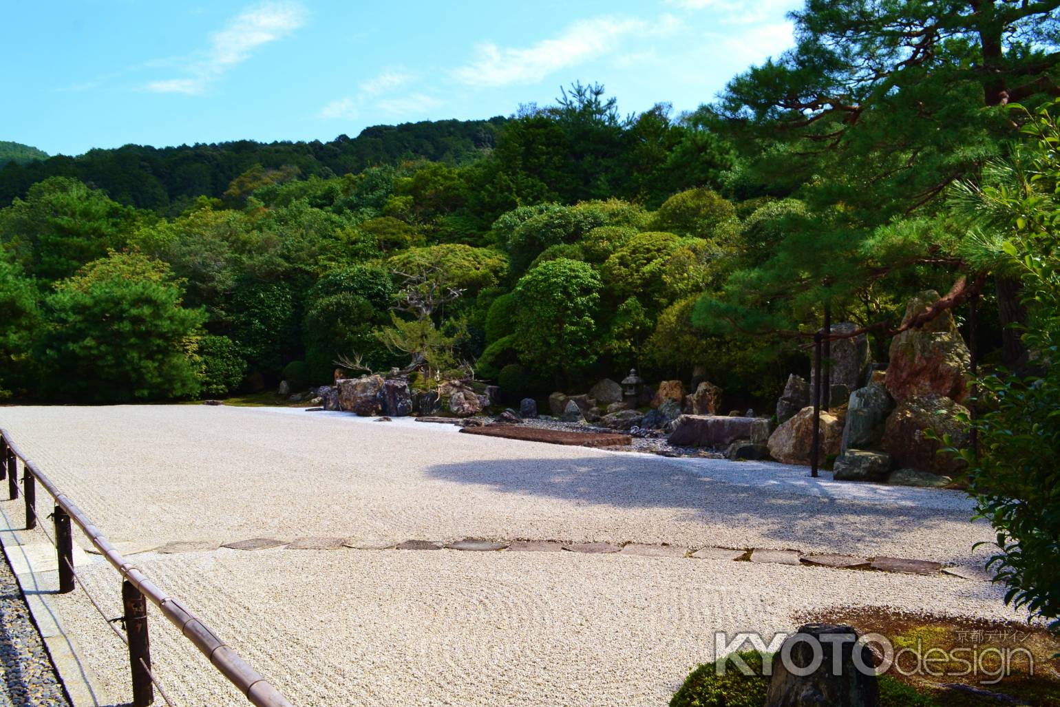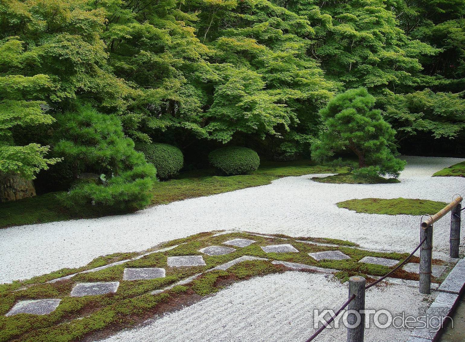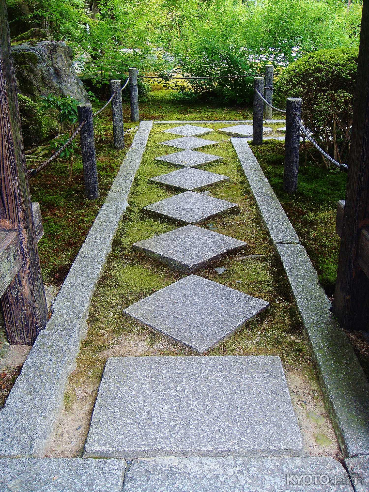 苔と菱形の石で構成された石畳と白砂のコントラストが美しい枯山水の庭園です。