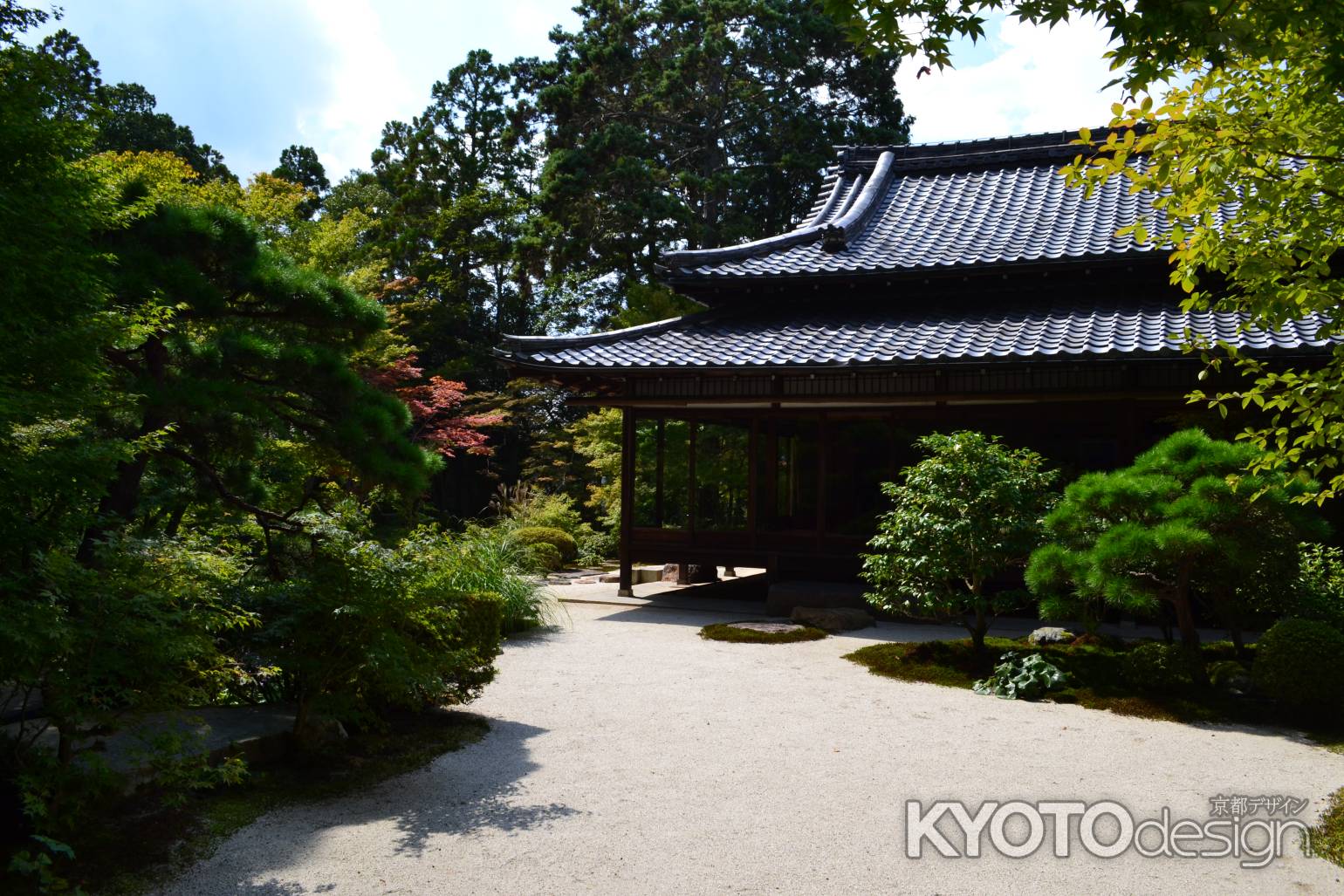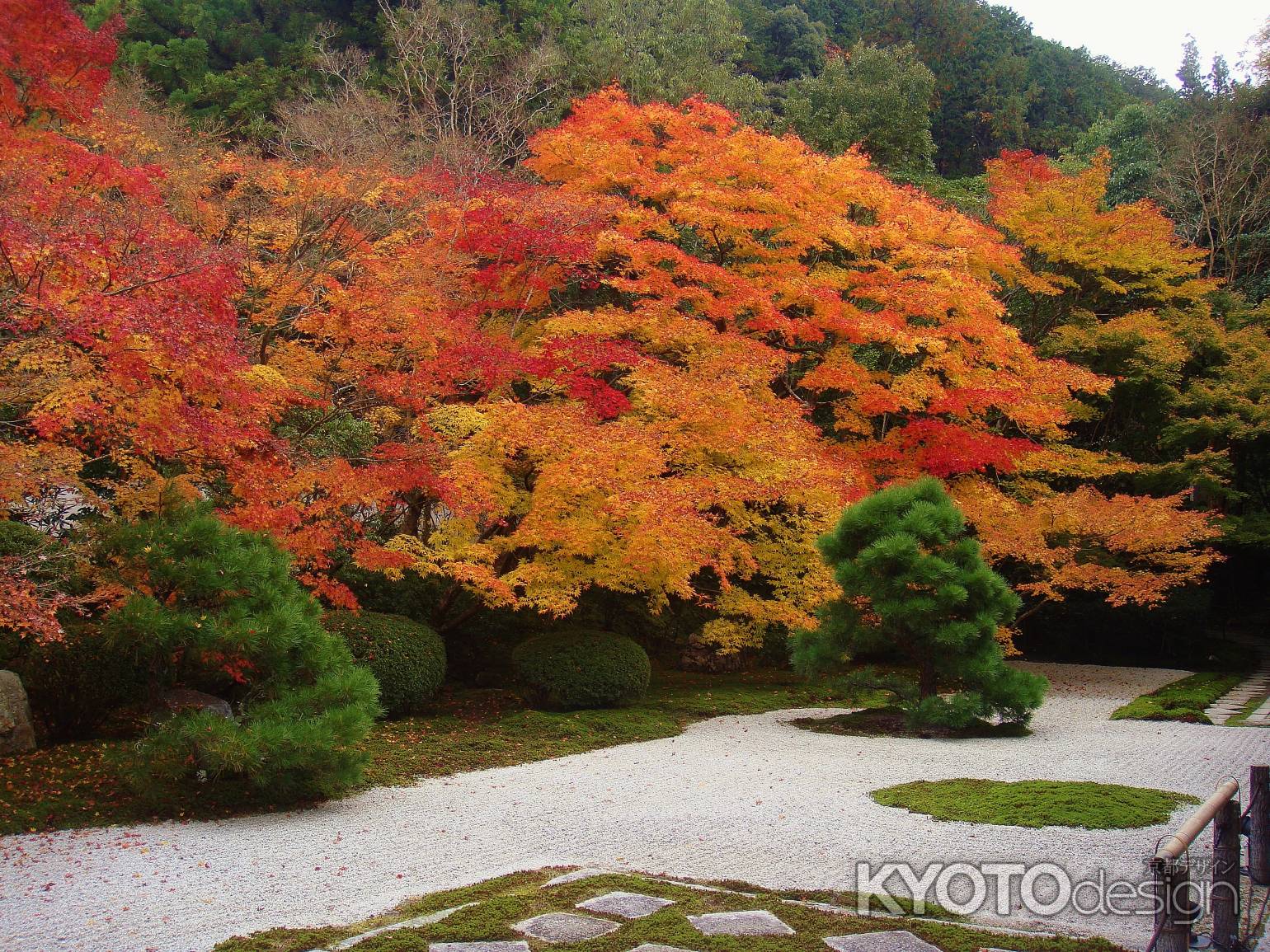 東庭では楓の赤、苔の緑、白砂の白が見事に調和しています。