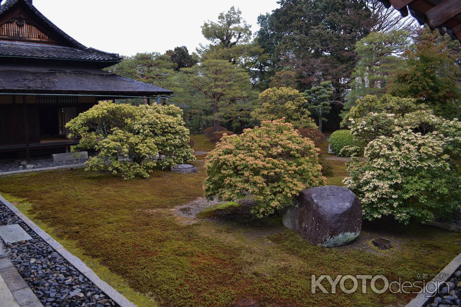 重森千青作庭による隨縁の庭です。四つ目の家紋にちなんでデザインされました。