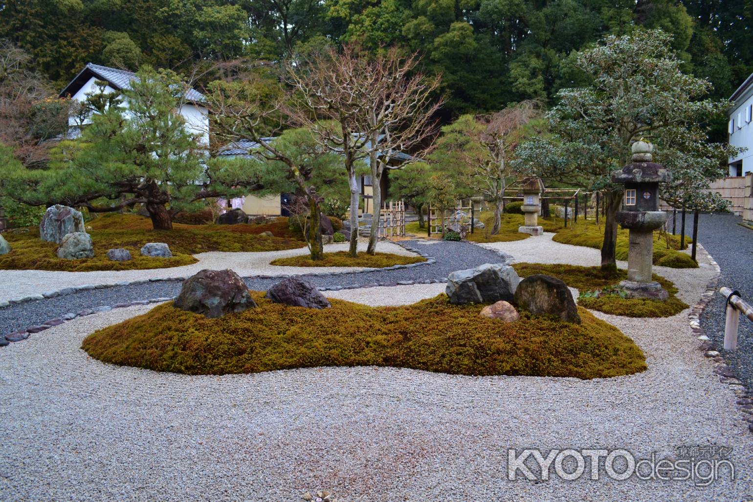 白砂の広々とした庭園のまわりに石組や石塔、松が配置してあります。