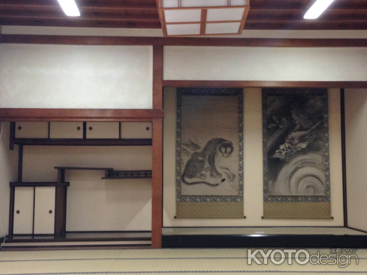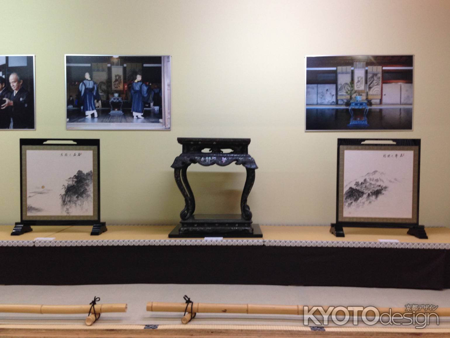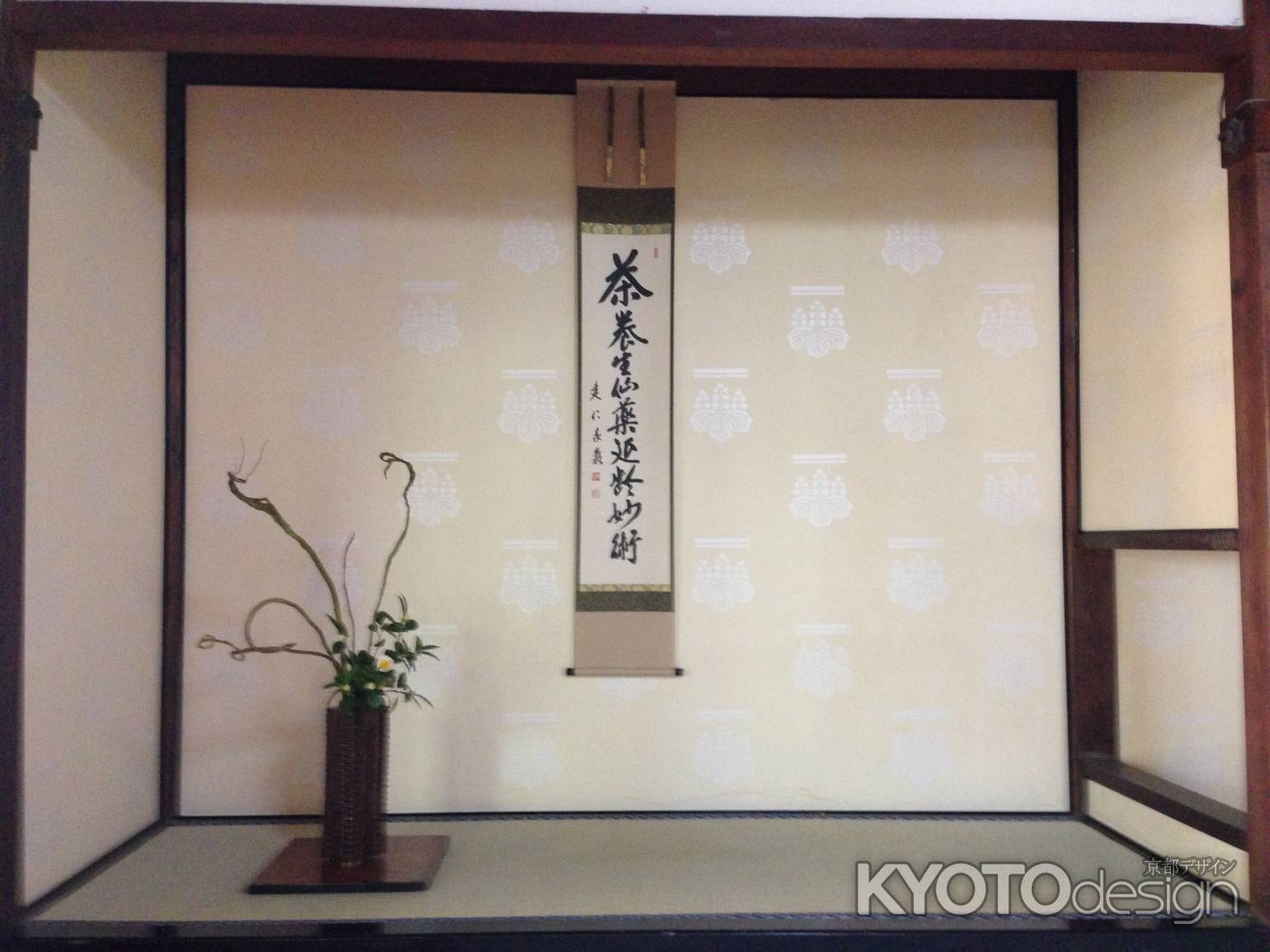 展示部屋の床の間。実際の四頭茶会では、方丈の正面中央に栄西の像が、そしその両脇に龍と虎の図が掛けられ、唐物の卓に香炉・花瓶・燭台が置かれます。