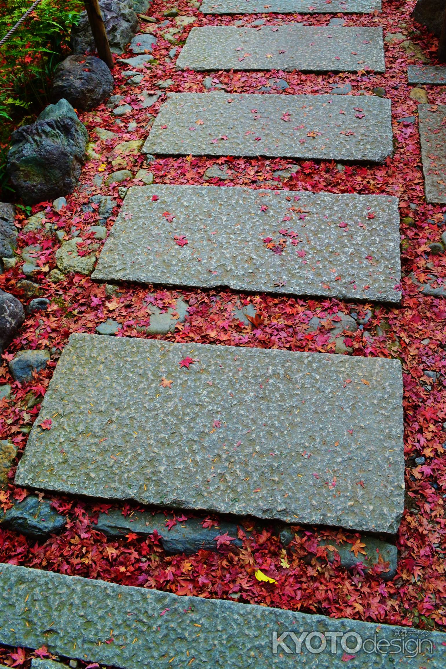 参道を歩いて空を見上げると紅葉が一面に、足元を見ると散り紅葉が石畳を彩ります。