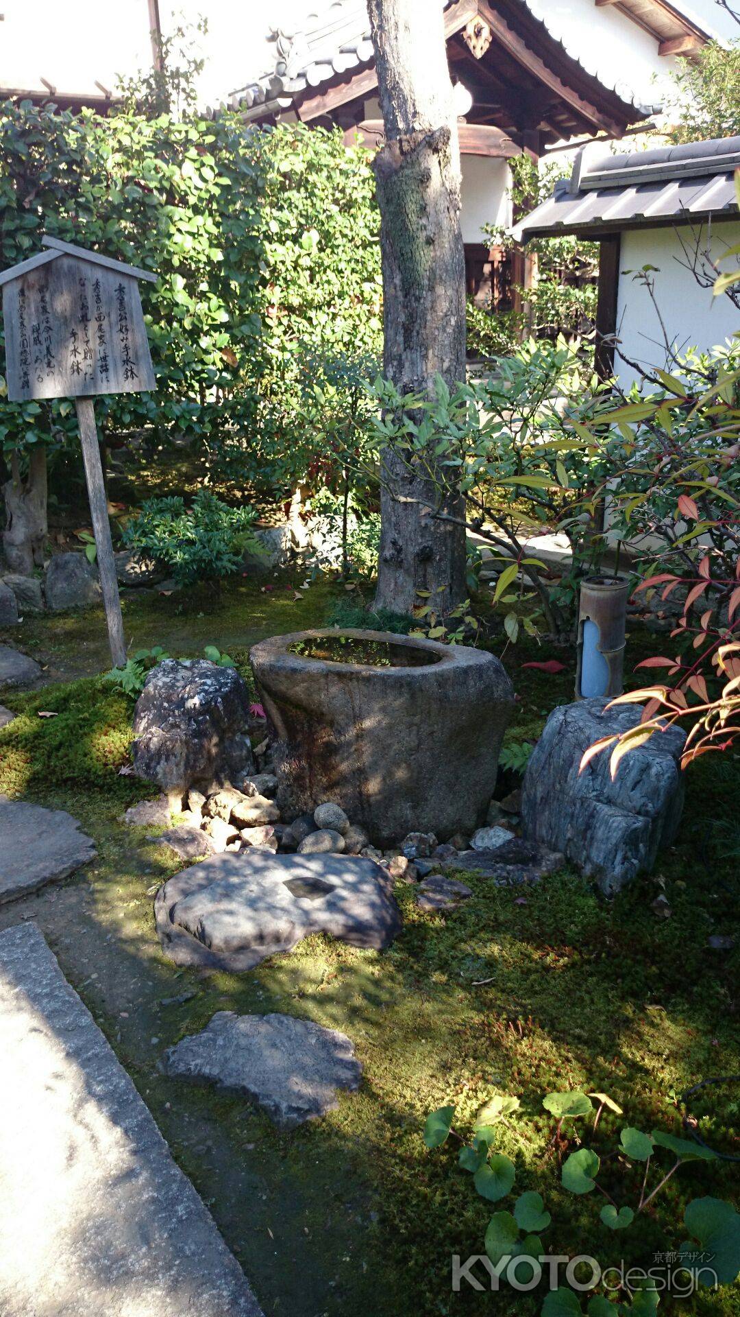 まっすぐ石畳を歩き、唐門を入るとすぐ、秀吉好みの手水鉢です。水面に葉が映りこんで揺れています。