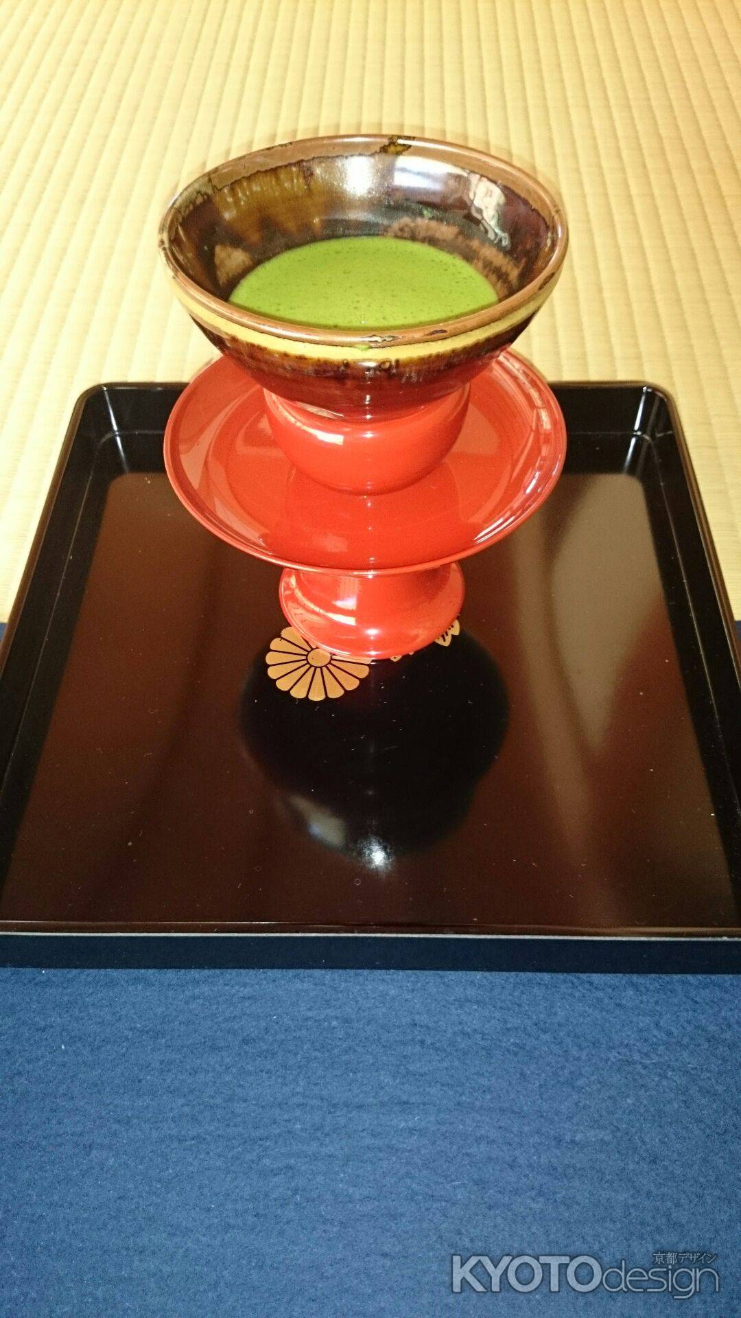 織部筆のお軸がかかった床の間を拝見し、しばらくすると、お盆に載った天目茶碗が運ばれてきます。