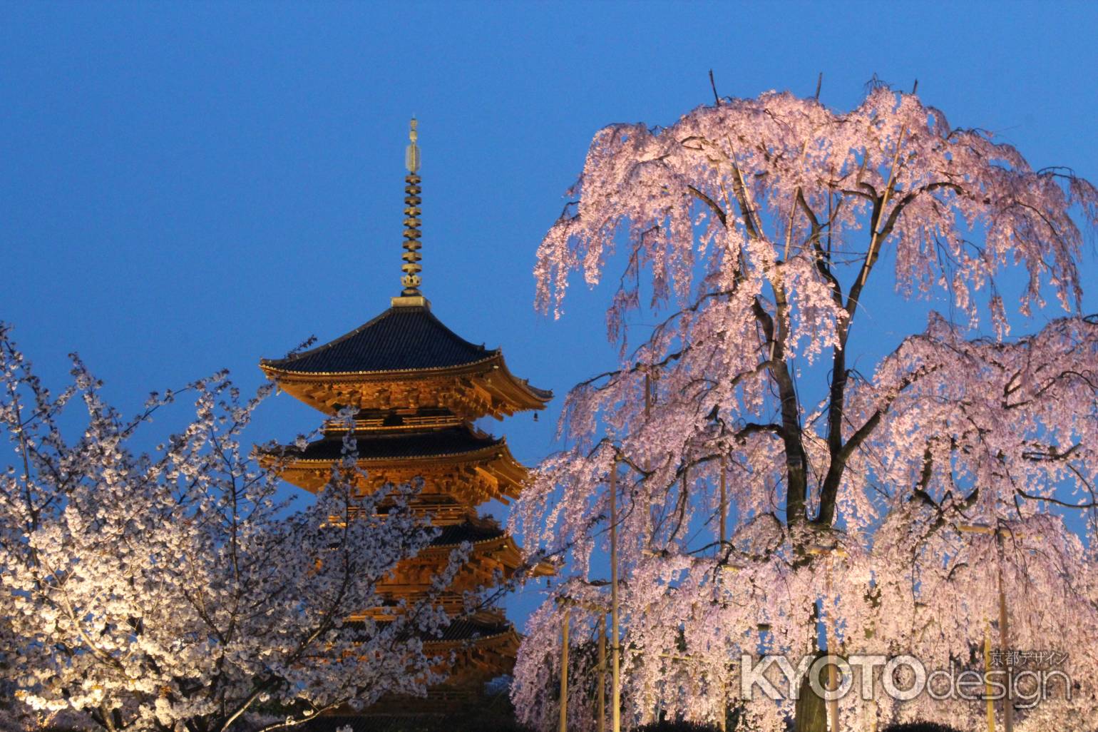 桜だけでなく、カエデも多く紅葉も見事である。三重の塔と桜の構図が京都らしい。