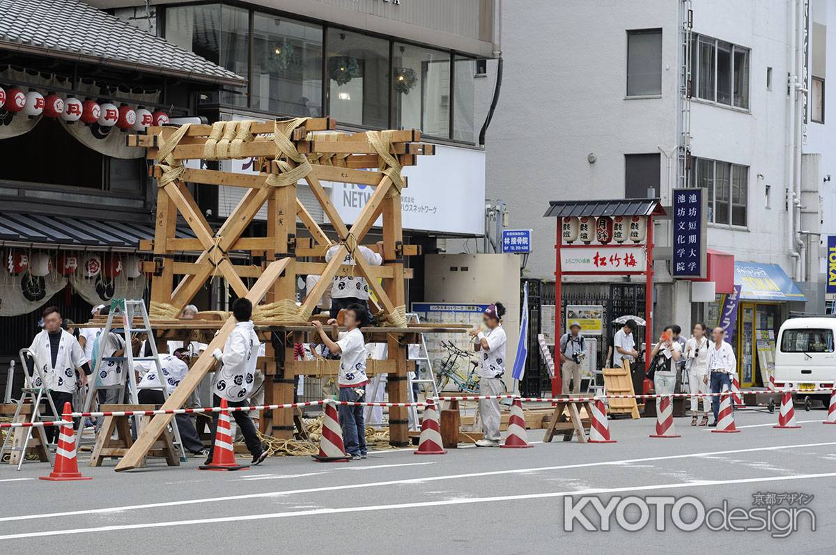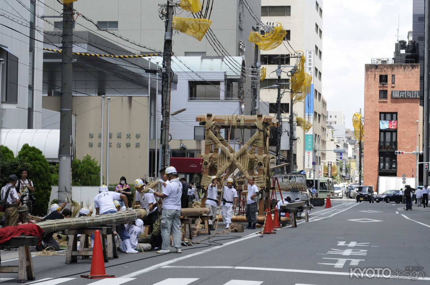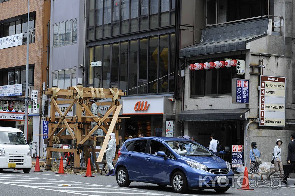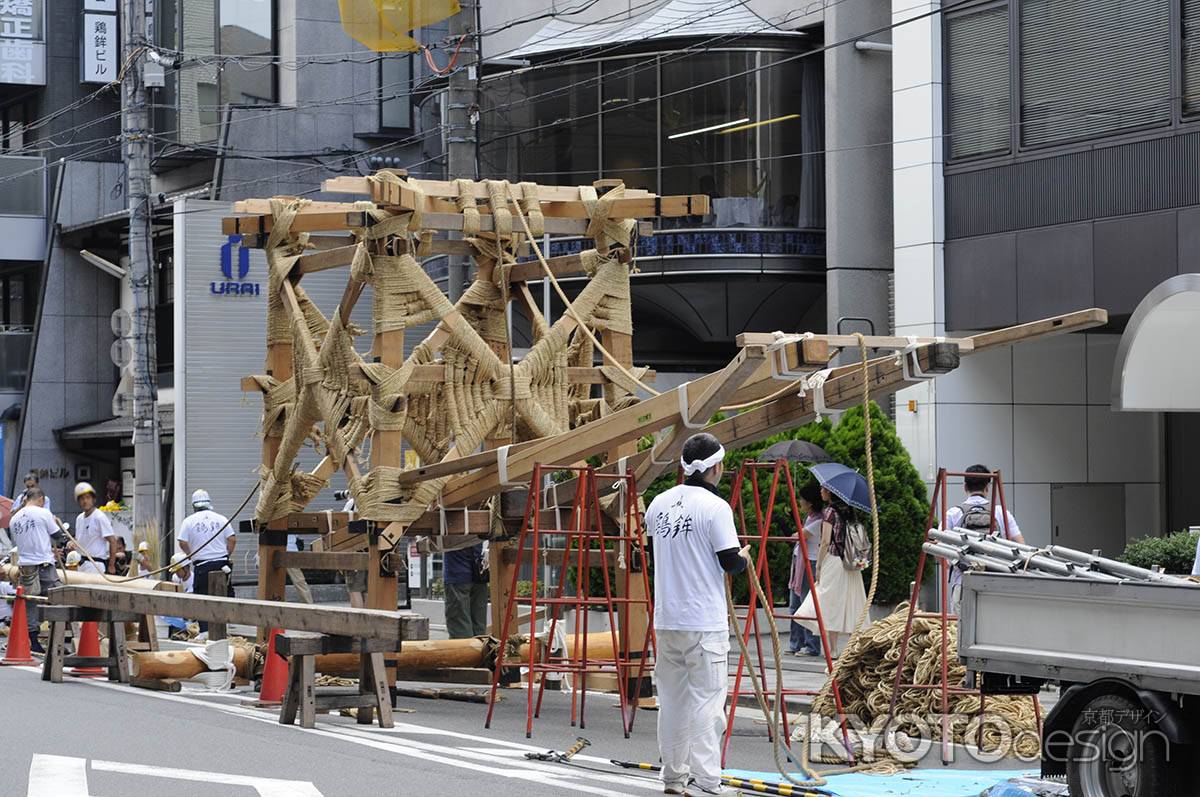 四条室町を北に行ったところにある鉾です。道が狭いせいか鉾立がはじまる時間も夕方。土台が組まれるのは夜でしょうか。