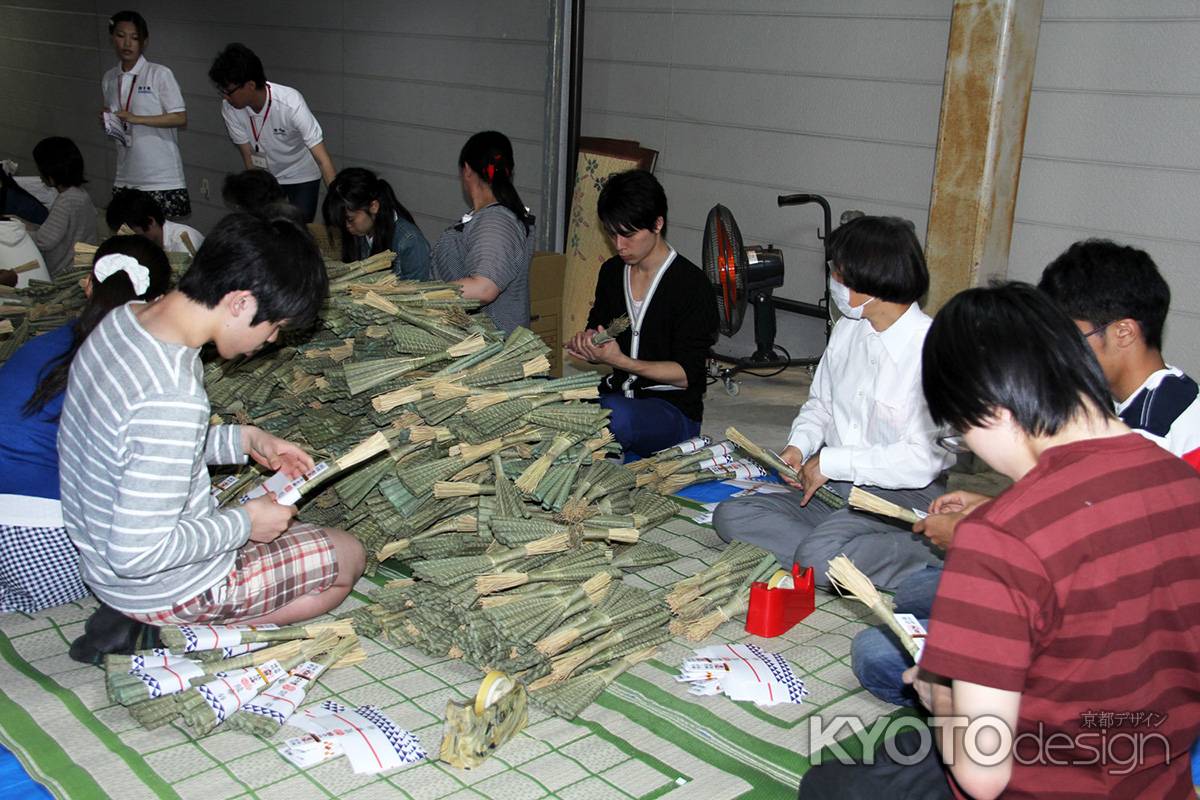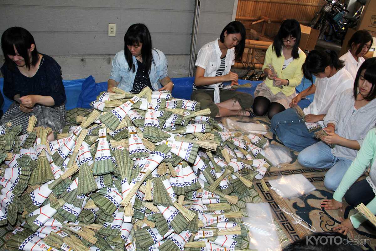 祇園祭が一日からはじまり、13日からは厄除けの粽(ちまき)の授与が始まりました。その粽作りには佛教大学の学生さんも参加してお手伝いされています。佛教大学の八木透教授が綾傘鉾保存会の理事を務められている縁で、毎年授業の一環で佛教大学の学生さんが粽作りを手伝っておられるそうです。なかには卒業してからも来られ、様々なお手伝いをされておる方もいらっしゃるそうです。学生さんたちは笹で作られた3800個の粽にお札を貼り付け、袋に入れて口を縛る作業をこなされました。