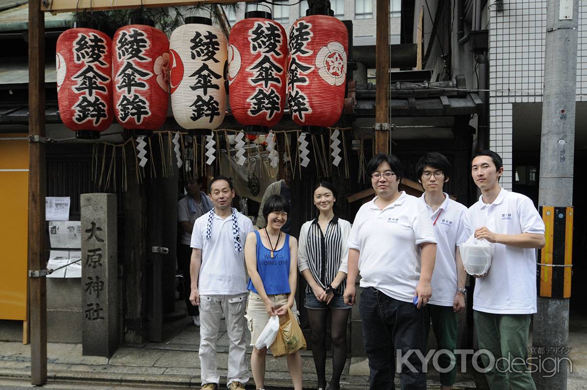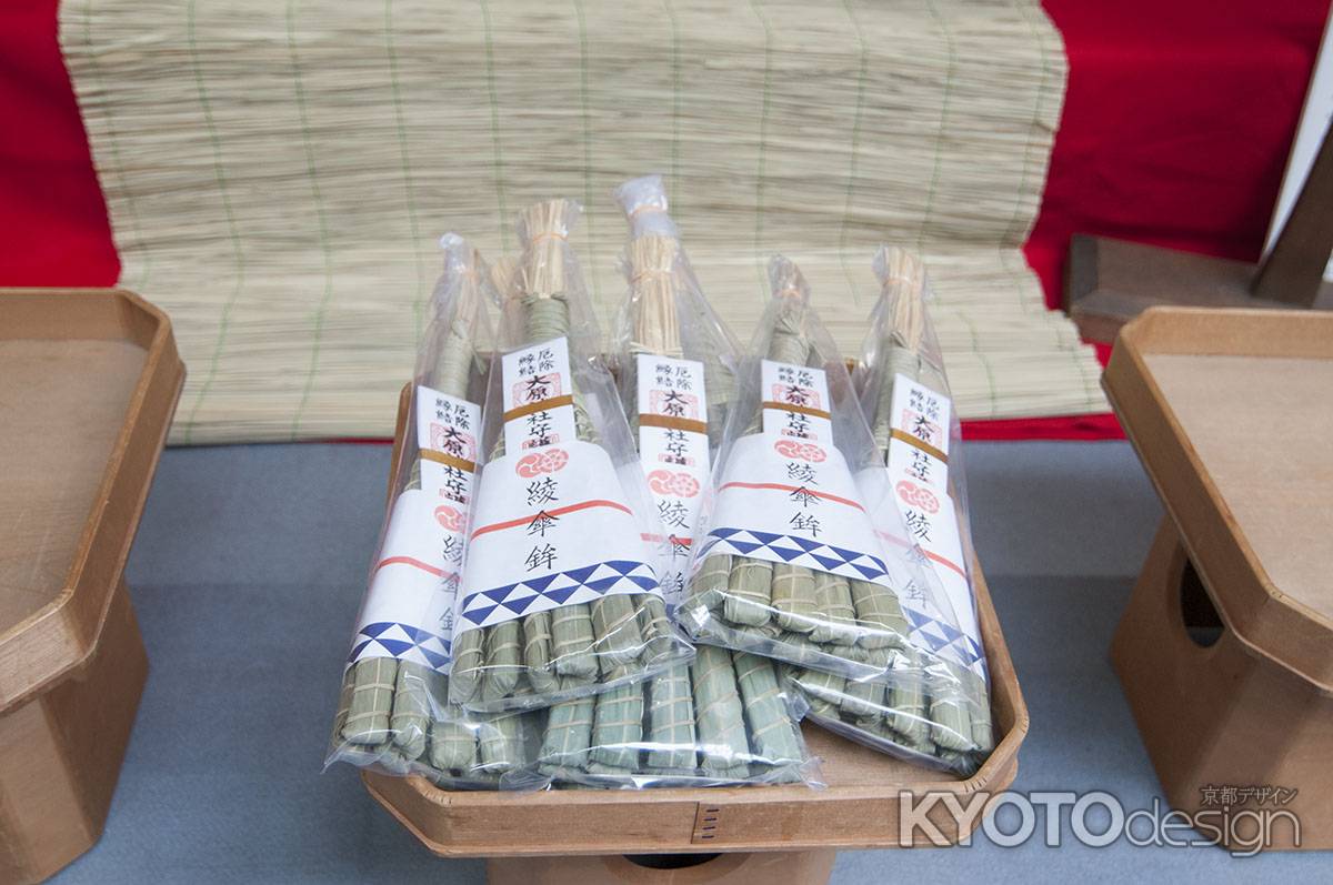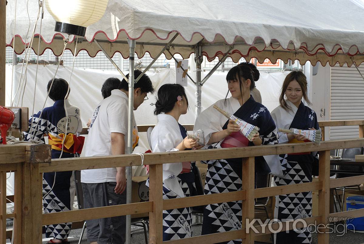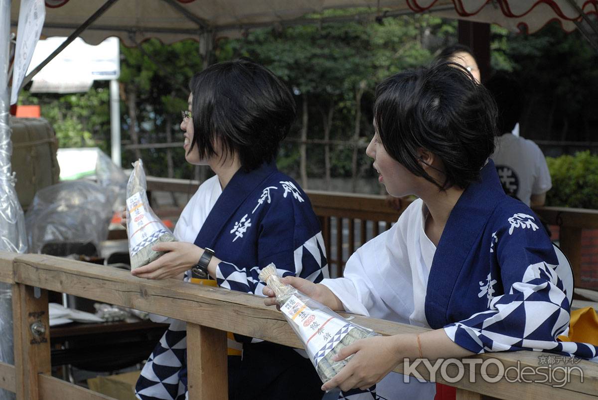 八坂神社から神職の方が来られ清祓式(鉾の清祓い)が行われ、会所が開かれます。会所が開かれると、当初その日に授与される予定の粽はあっという間に無くなってしまうほど多くの人が訪れました。綾傘鉾の粽は厄除けの他に安産や縁結びのご利益もあるそうです。また、会所の他に鉾が建っている場所でも佛教大学の学生さんが浴衣姿で粽を売られています