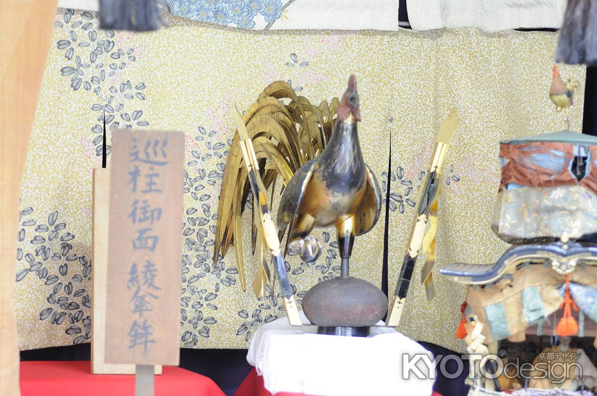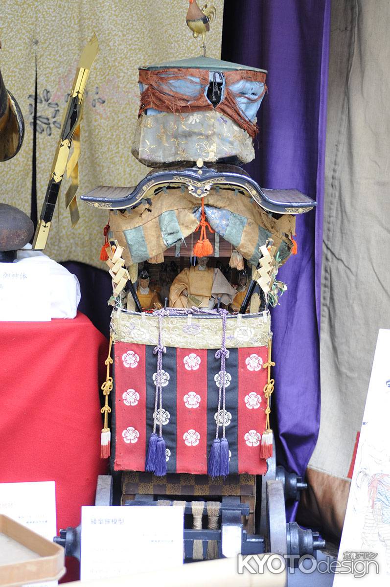綾傘鉾の会所は大原神社です。粽の他にも、現在は使われていない傘垂がりや、江戸末期に焼亡した“曳き鉾版綾傘鉾”の模型、巡行で使用する御面、明治期の祇園囃子の譜面など多数の貴重品が7月13日~16日の期間、展示・公開されます。