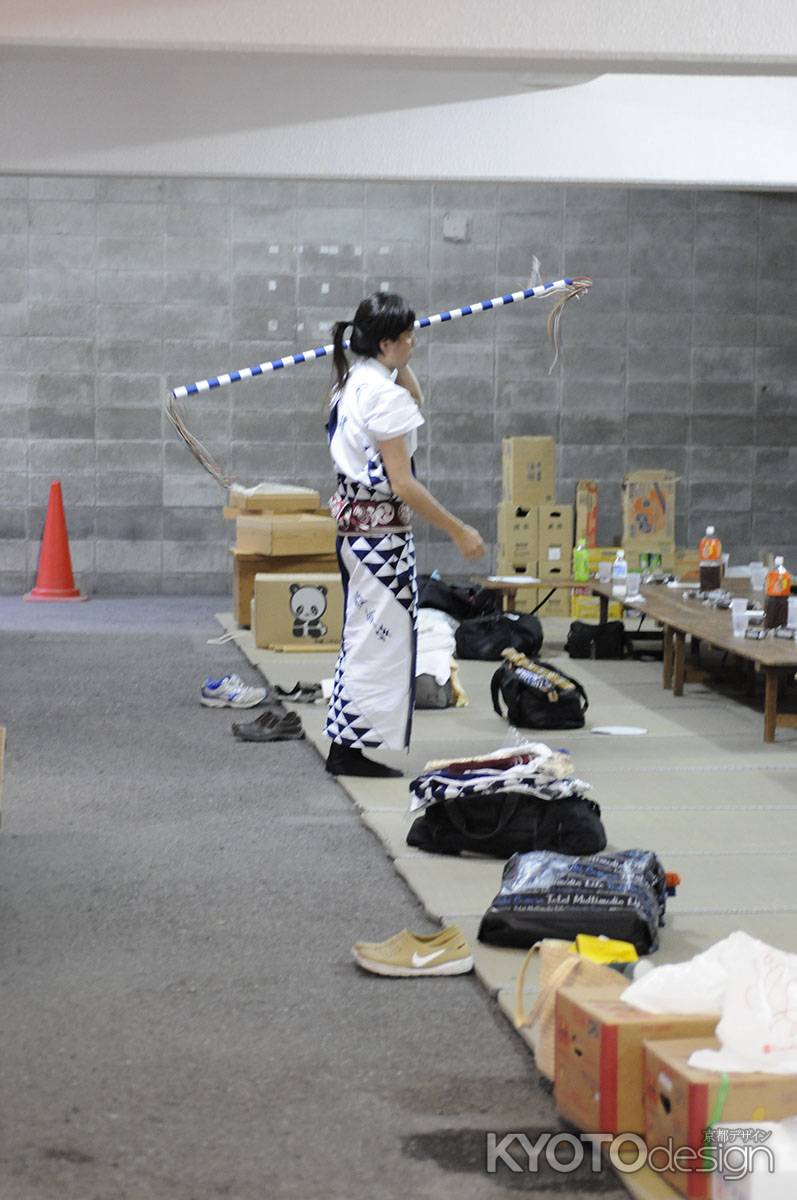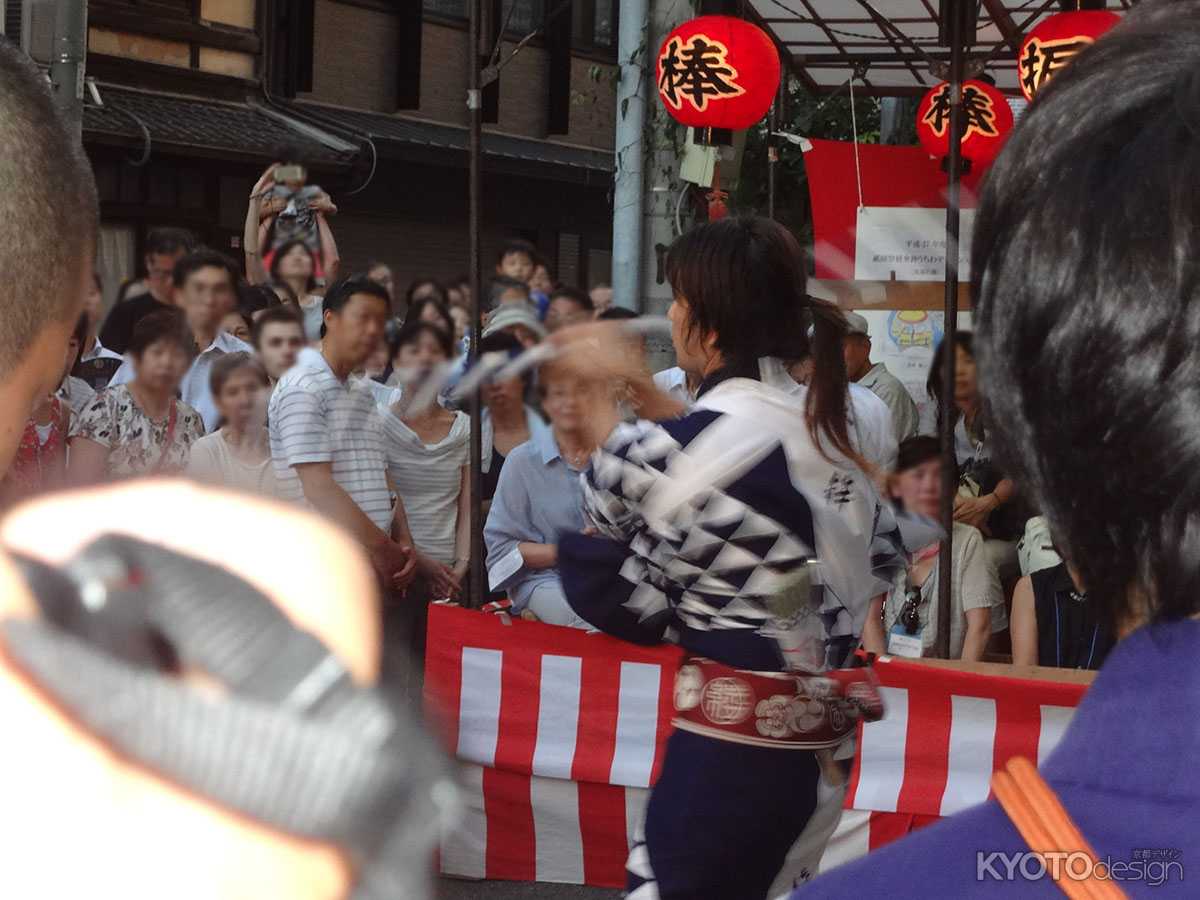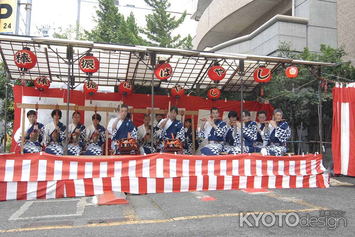 宵山の3日間1日数回、綾傘鉾の南東側のガレージで棒振り囃子が披露されています。綾傘鉾の棒振り囃子は壬生六斎念仏保存会の皆さんにより演じられていて、巡行当日は赤熊(しゃぐま)や面をつけられますが、宵山で披露される際は綾傘鉾の浴衣に素顔という出で立ちで演じられます。