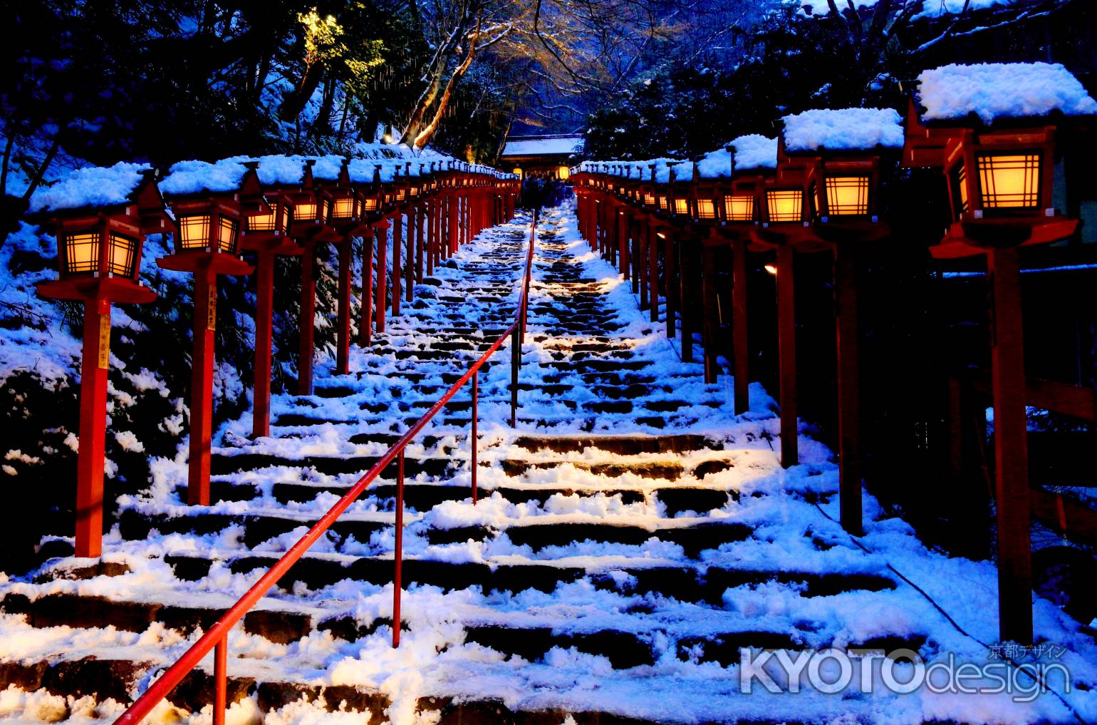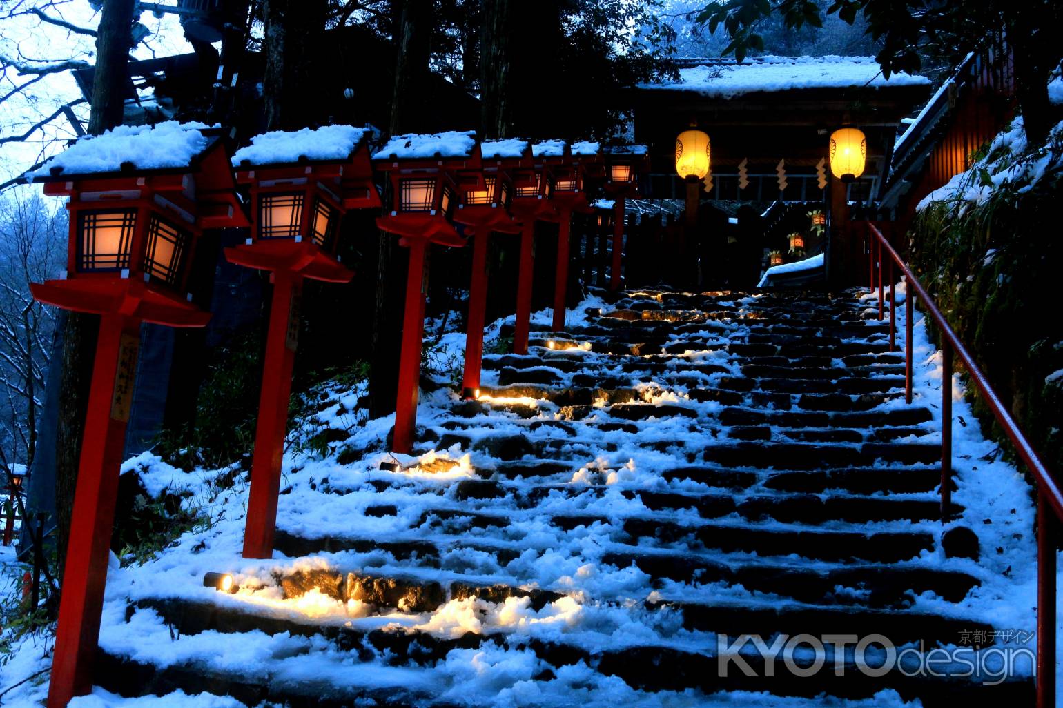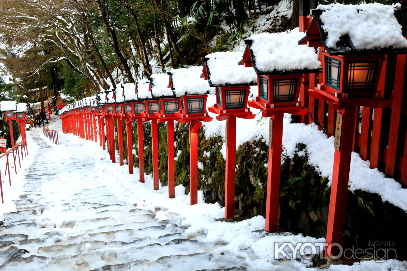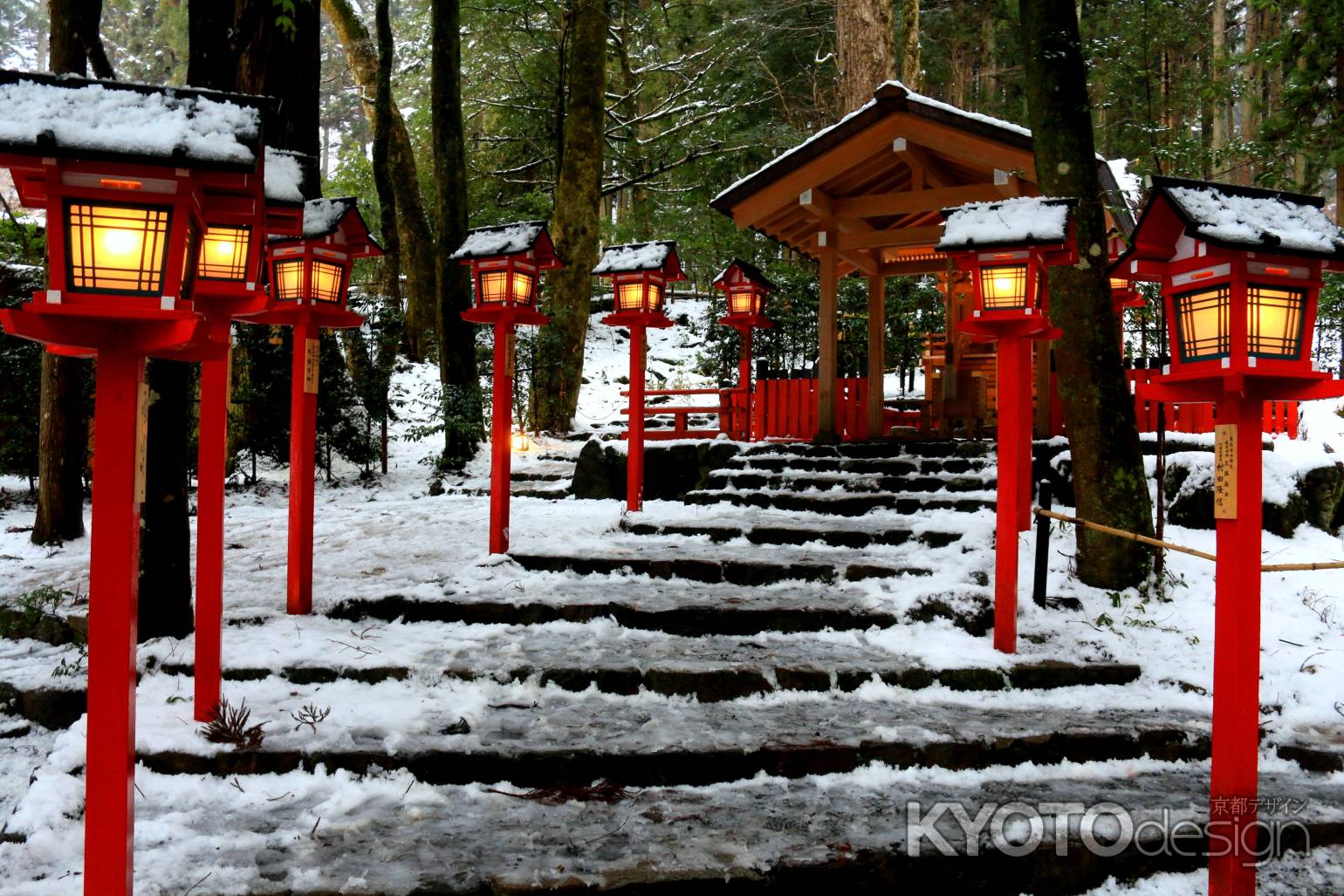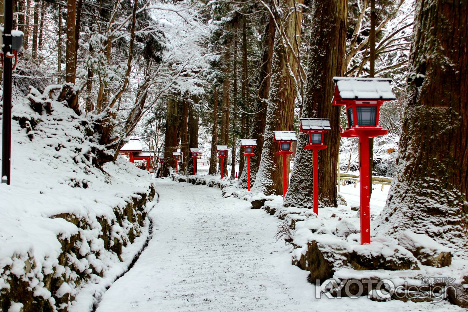 貴船神社は、一年中訪れる人が絶えないところです。特に、雪が積もった時の、燈籠の朱色と雪の白色のコントラストは鮮やかで、一度は実際に見てみたいところです。昨年から、雪がしっかり積もった日の晩は、ライトアップされるようになりました。幻想的なその雰囲気は写真ではとても切り取れません。ちなみに鞍馬寺までは、鞍馬山を越えて40分ほど、雪の日は少しつらいかも。
