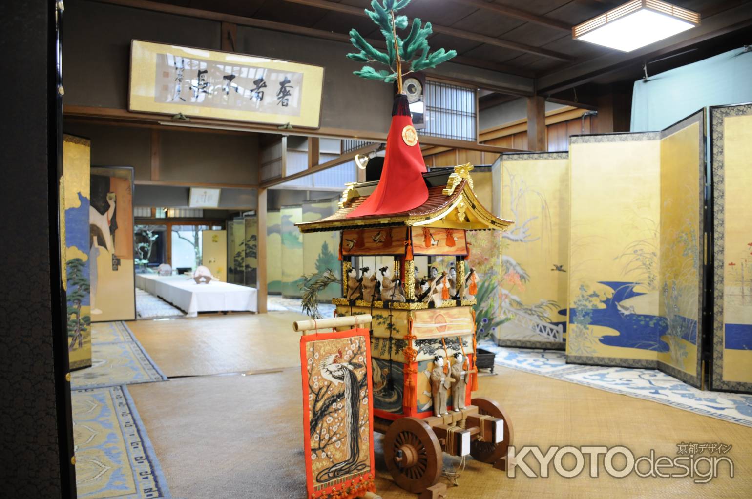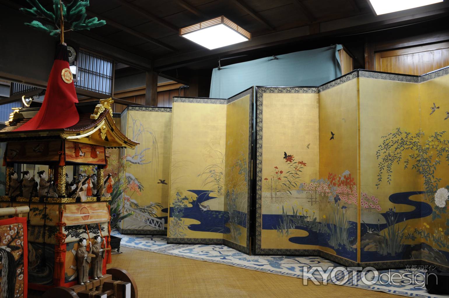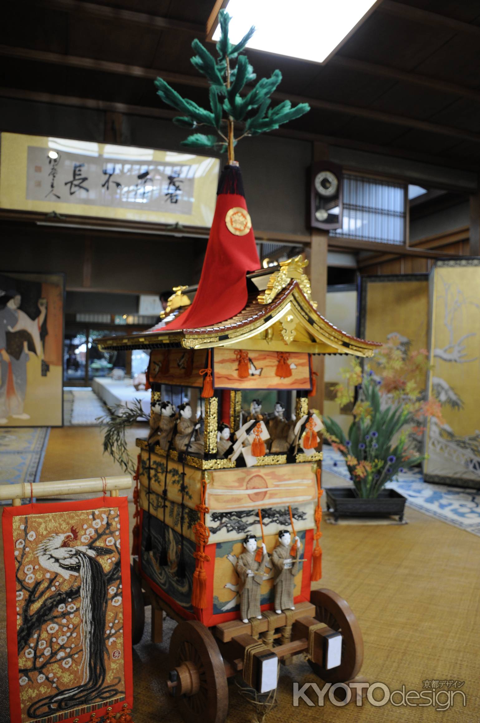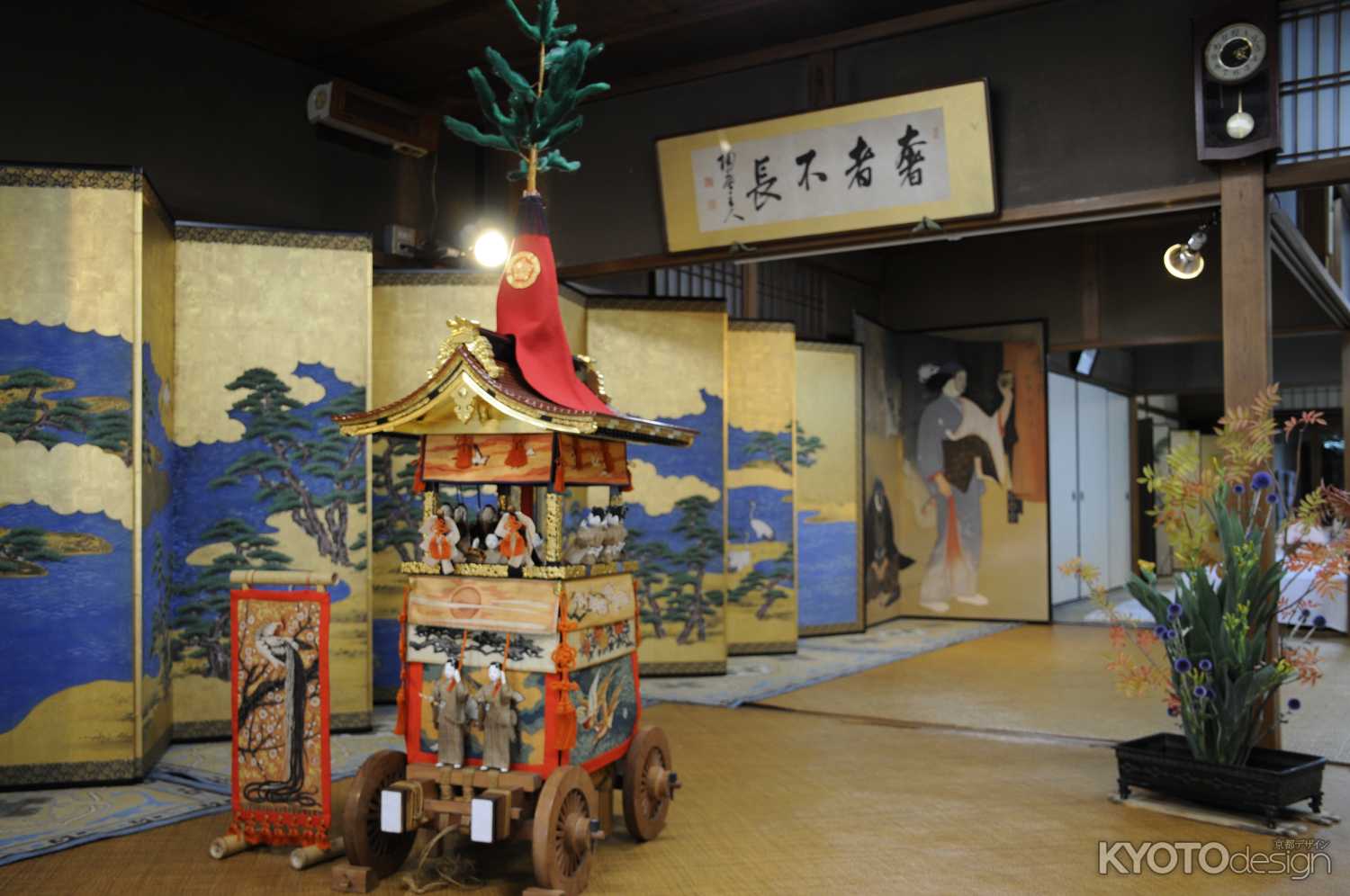 館内には数々の屏風、そしてミニチュアの鉾、生け花が飾れています。