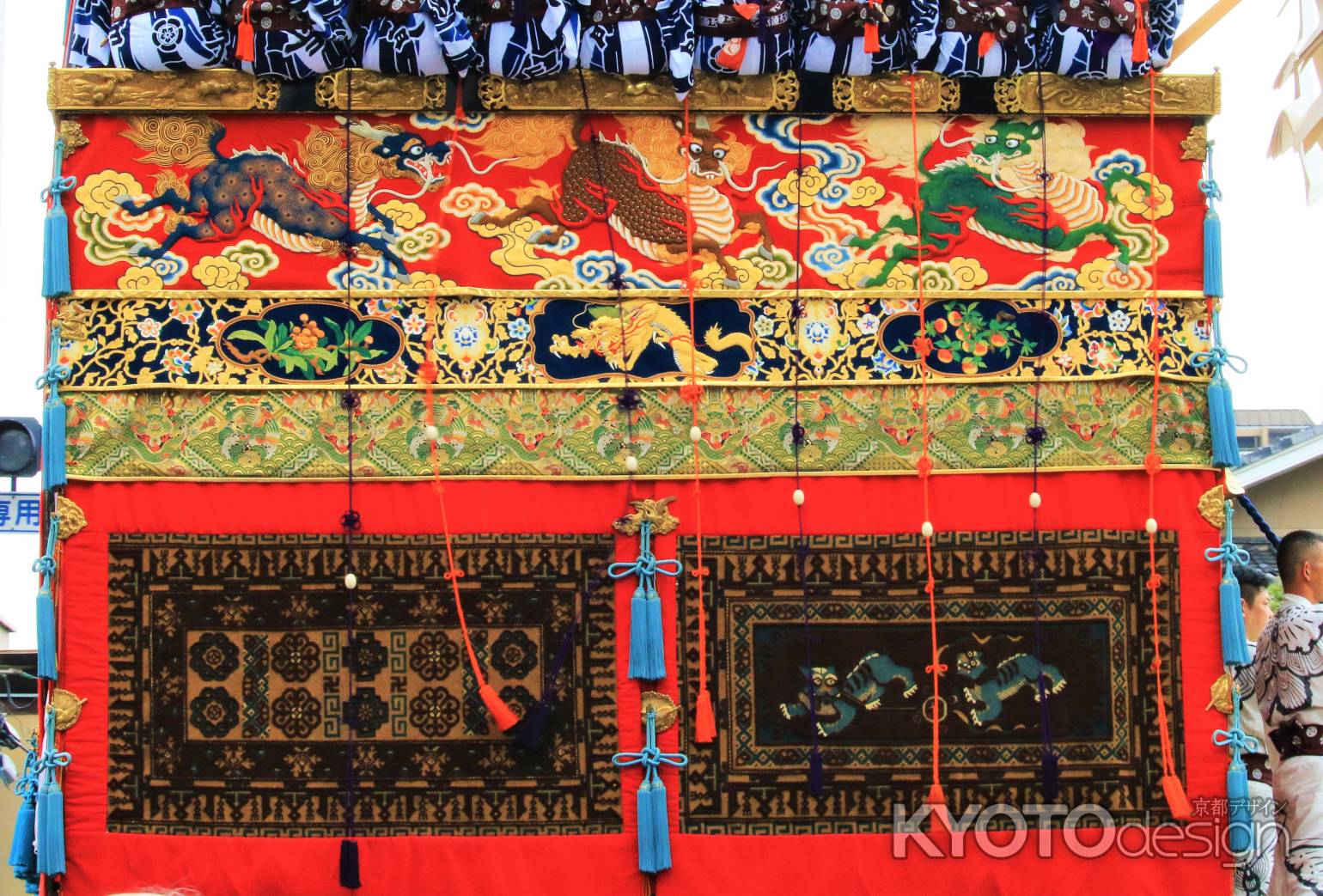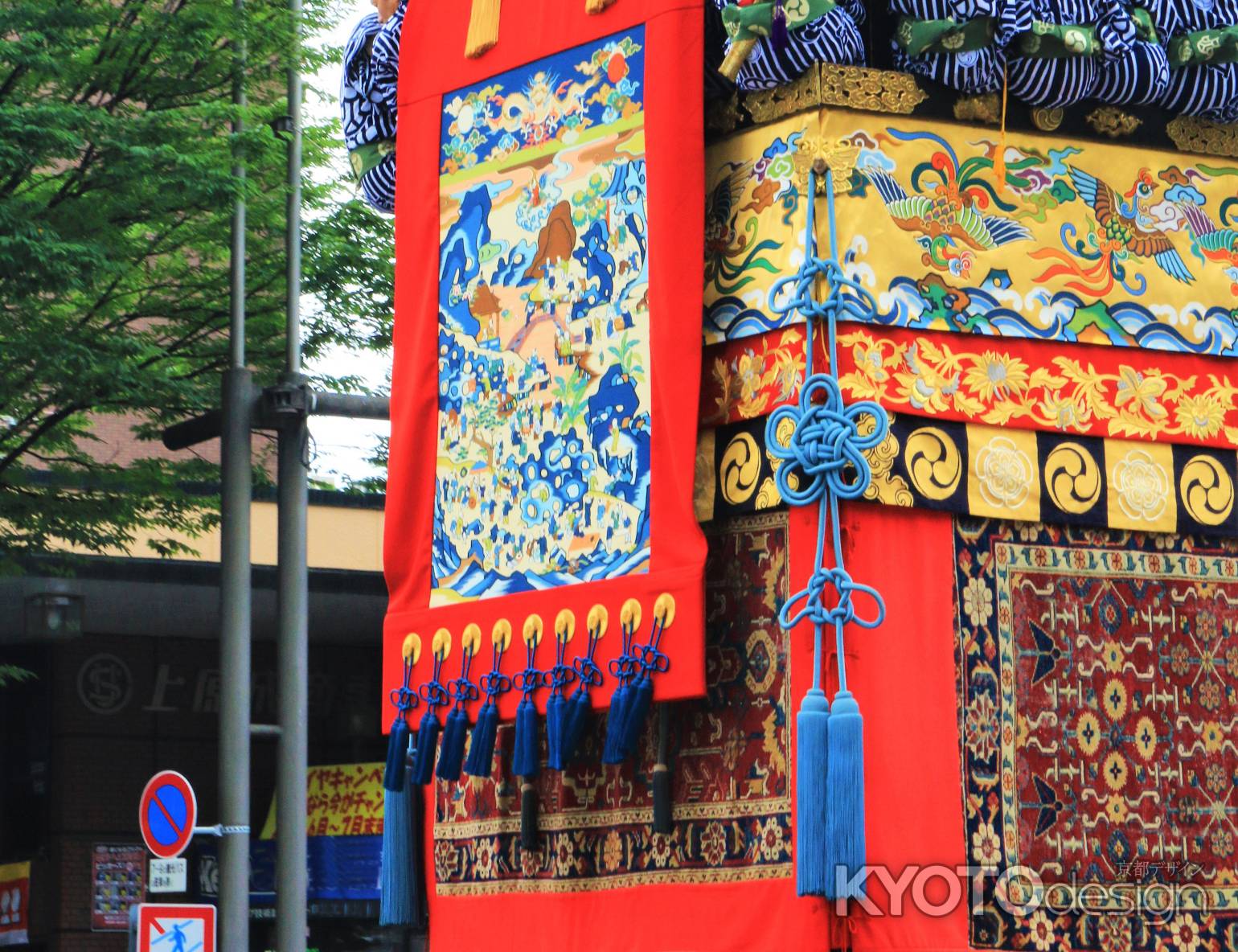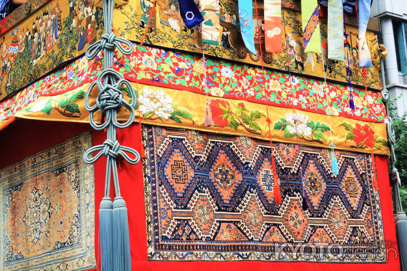 山鉾を飾る前懸、胴懸や見送などは、インドや中国、ペルシャなどで作られたものも多くありとても鮮やかです。よく、こんなにきれいに保存され続けていると感心します。まさに動く美術館ですね。胴懸で揺れているのは囃子方の紐です。