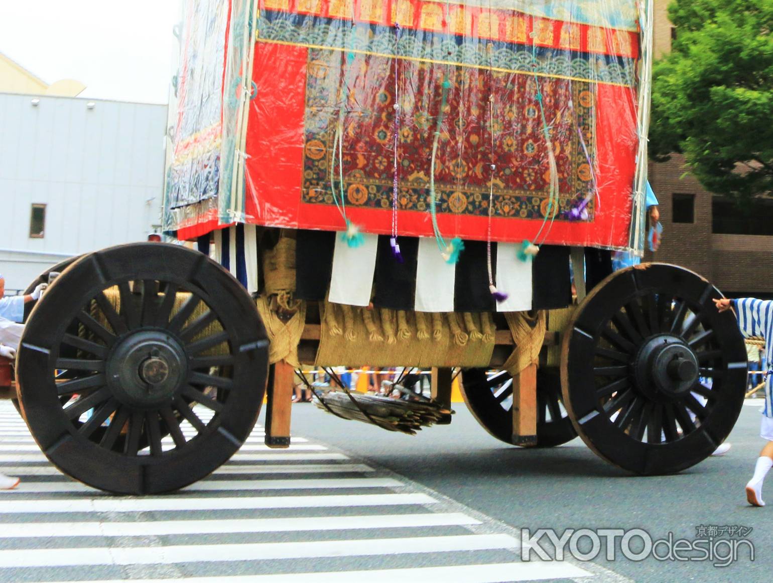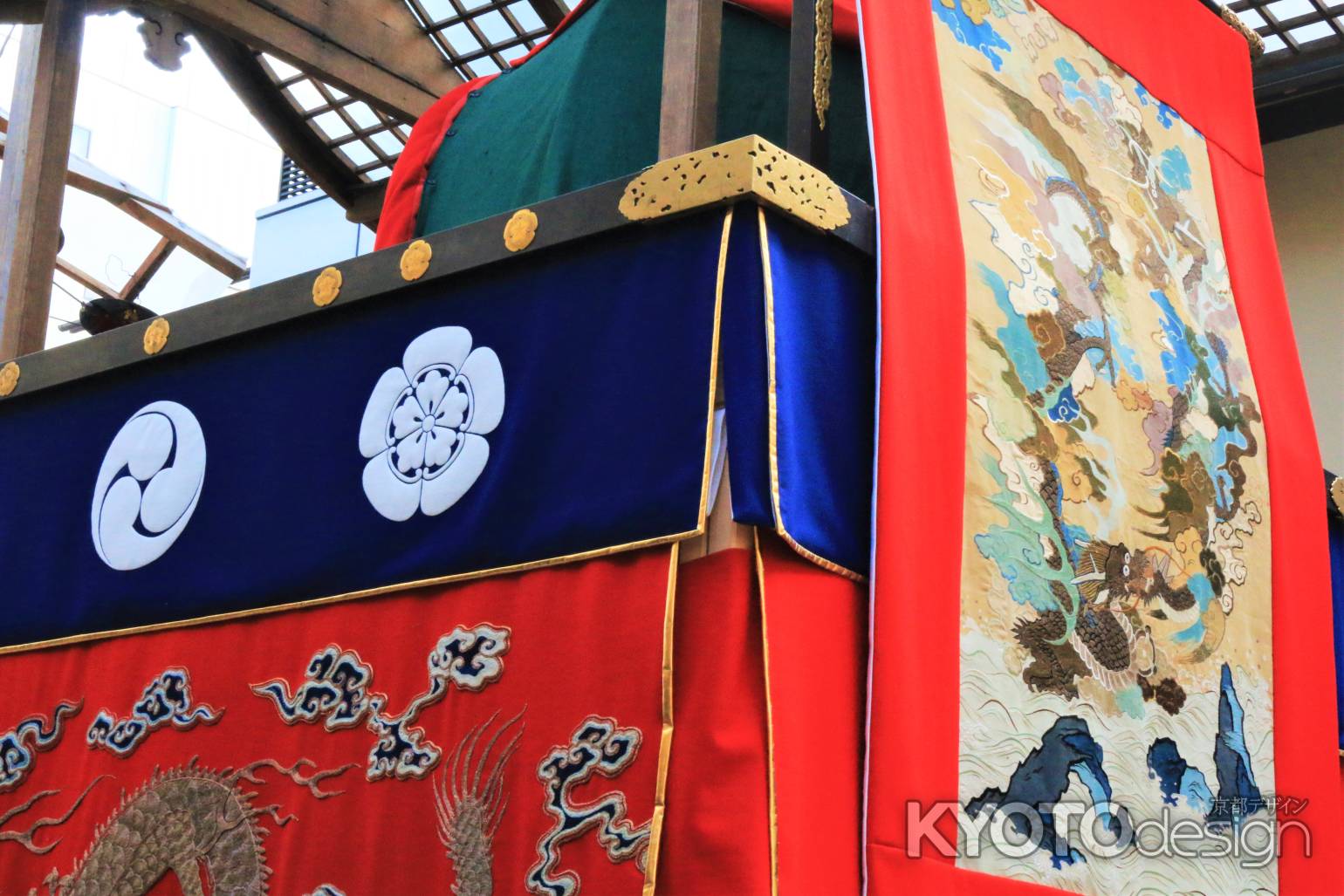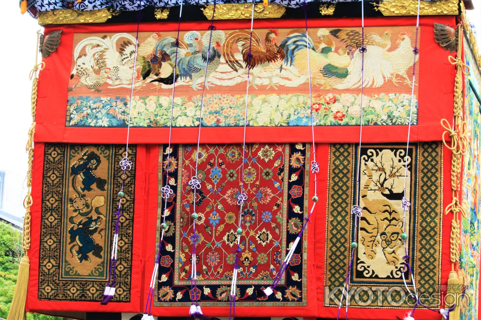 山鉾を飾る前懸、胴懸や見送などは、インドや中国、ペルシャなどで作られたものも多くありとても鮮やかです。よく、こんなにきれいに保存され続けていると感心します。まさに動く美術館ですね。胴懸で揺れているのは囃子方の紐です。