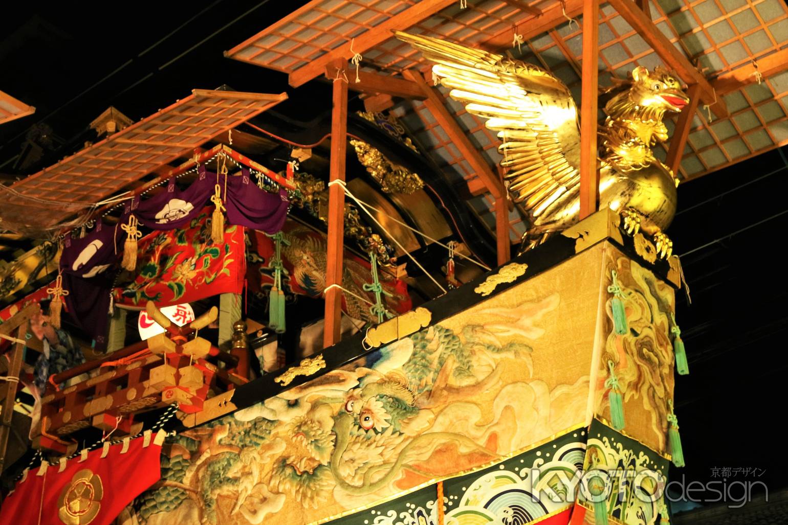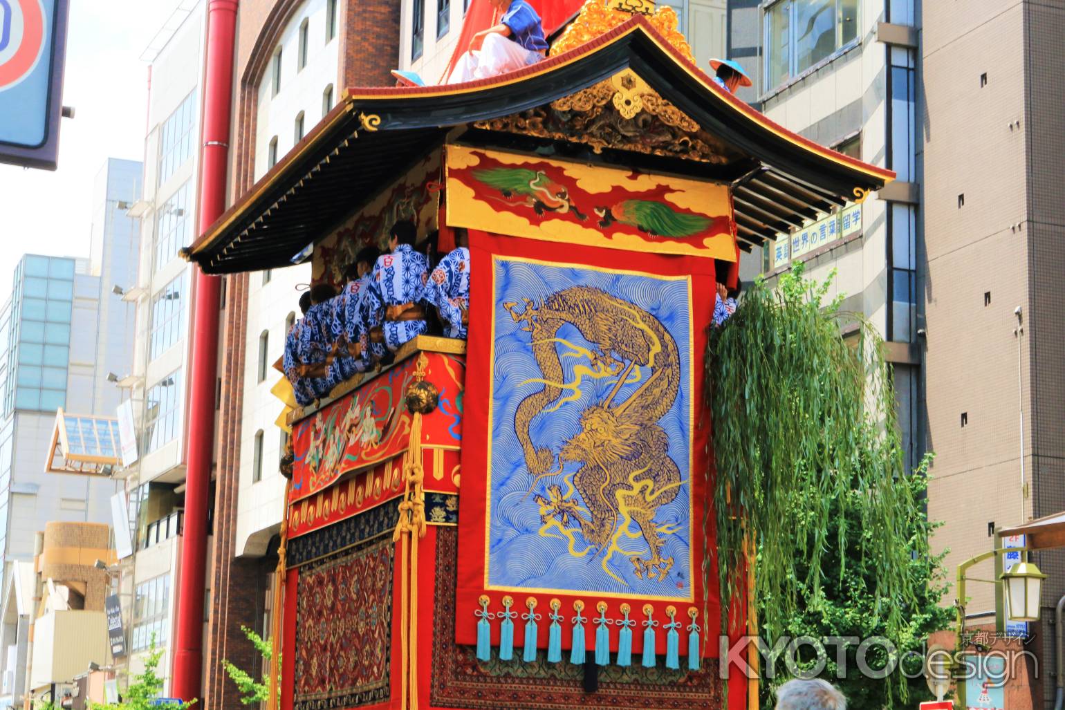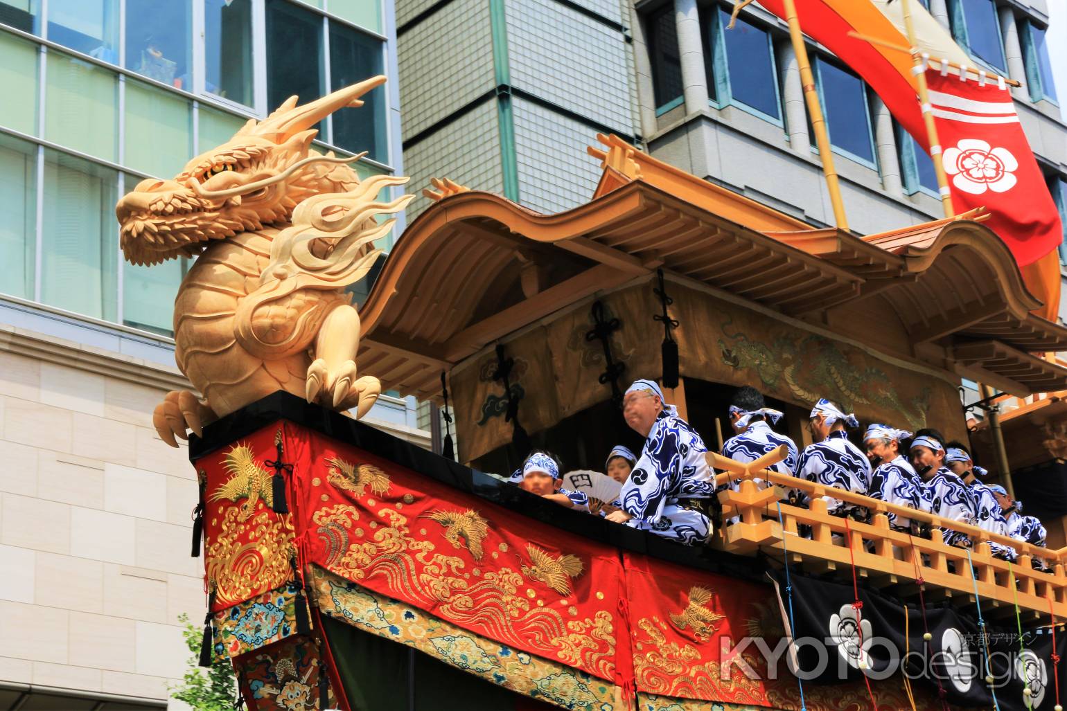 船鉾には金色に輝く鳳凰、大船鉾の舳先には龍頭が飾られ、とても荘厳です。大船鉾は、2014年から約150年ぶりに旧来の形に復興し、今年は舳先の龍頭も新調されたそうです。前祭の船鉾は「出陣船鉾」、後祭の大船鉾は「凱旋船鉾」とも言われ後祭の殿(しんがり)を務めている。