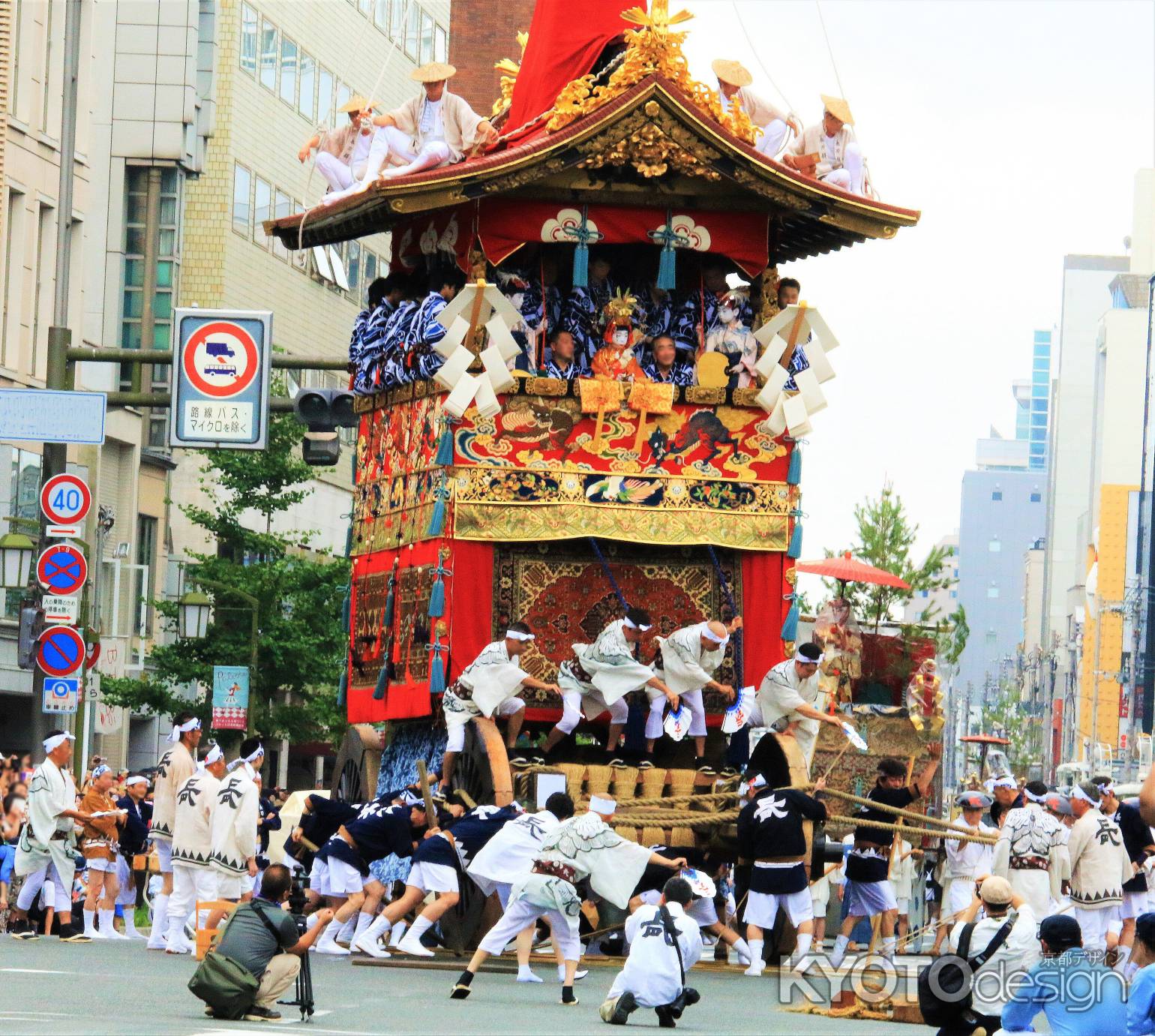 巡行のハイライトの一つである辻廻し。重さ10~15トン屋根までの高さ約8メートル鉾先までは約25メートルにもなる鉾を90度回転させるのは、繊細で緻密、かつ豪快です。屋根に乗っている人は、バランスをとったり、電線や障害物にあたらないようにしています。昔は、障害になる電線は、巡行の間だけ切断していたそうです。