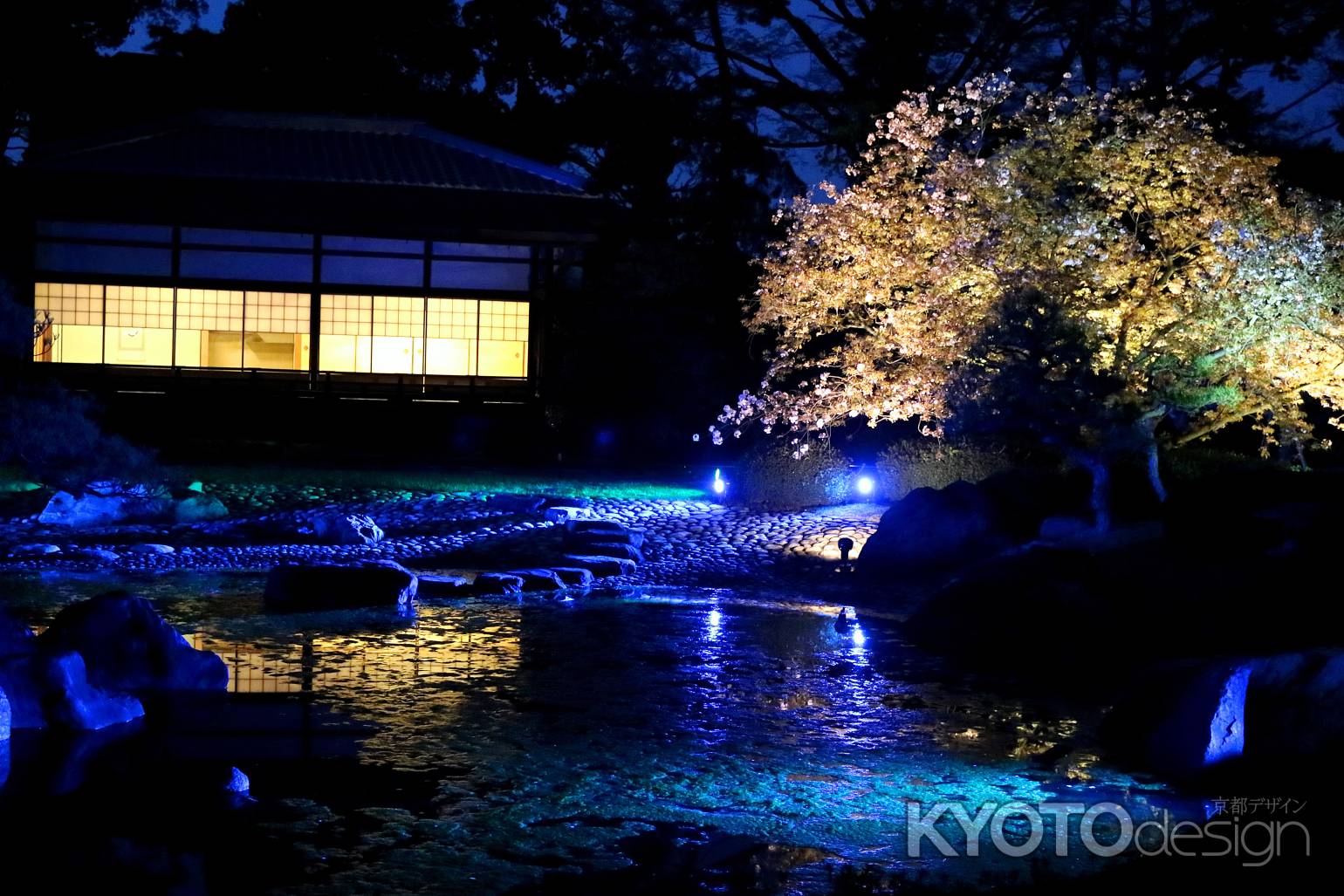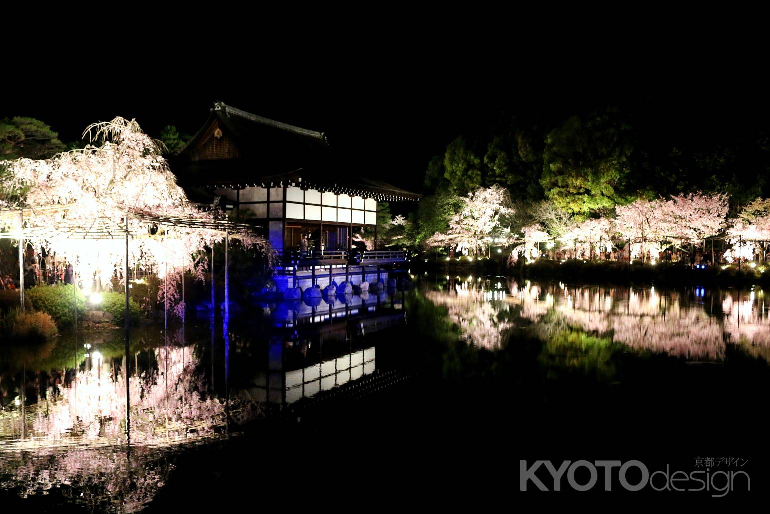 神苑の枝垂れ桜たちが、有名ですばらしい。青空のもとに見る桜や朱色の建物が実にみごとであるが、ライトアップされた様子は、美しさが際立っている。また、栖鳳池に映る桜も一層美しい。ライトアップは、紅しだれコンサートになっているので、注意が必要。