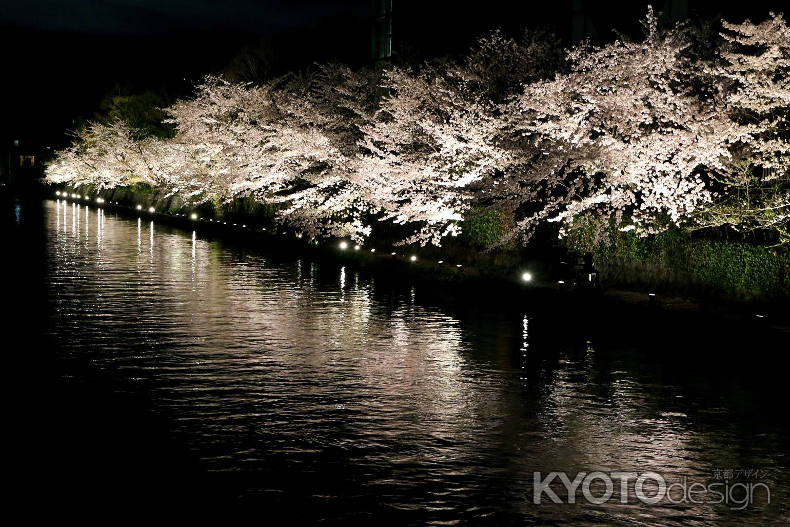 岡崎桜回廊ライトアップ。ライトアップに照らされた桜並木が、疎水に映る様は、ほんとうにきれい。水上観光船の十石船も運行されており、身近に桜並木の美しさを眺めることもできる。また、その船が立てる波に揺れるところもまた、美しい。