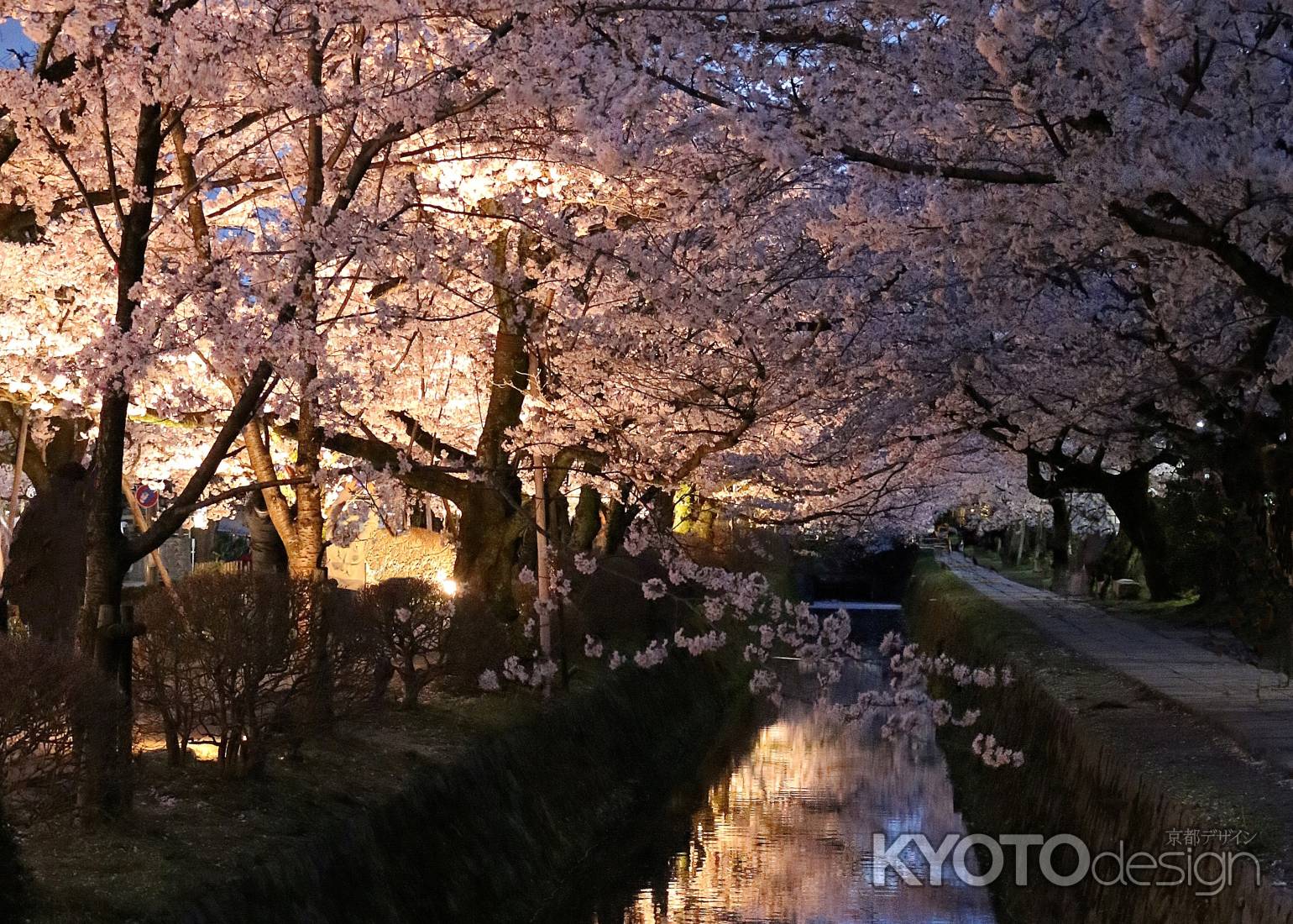 哲学の道のはずれ、白沙村荘沿い今出川通りのライトアップ。2016年に実施されたが、今年以降実施されるかは未定。哲学の道は、熊野若王子神社から銀閣寺までの疎水沿いに続く桜並木が美しいが、ライトアップされる場所は限られているので注意。
