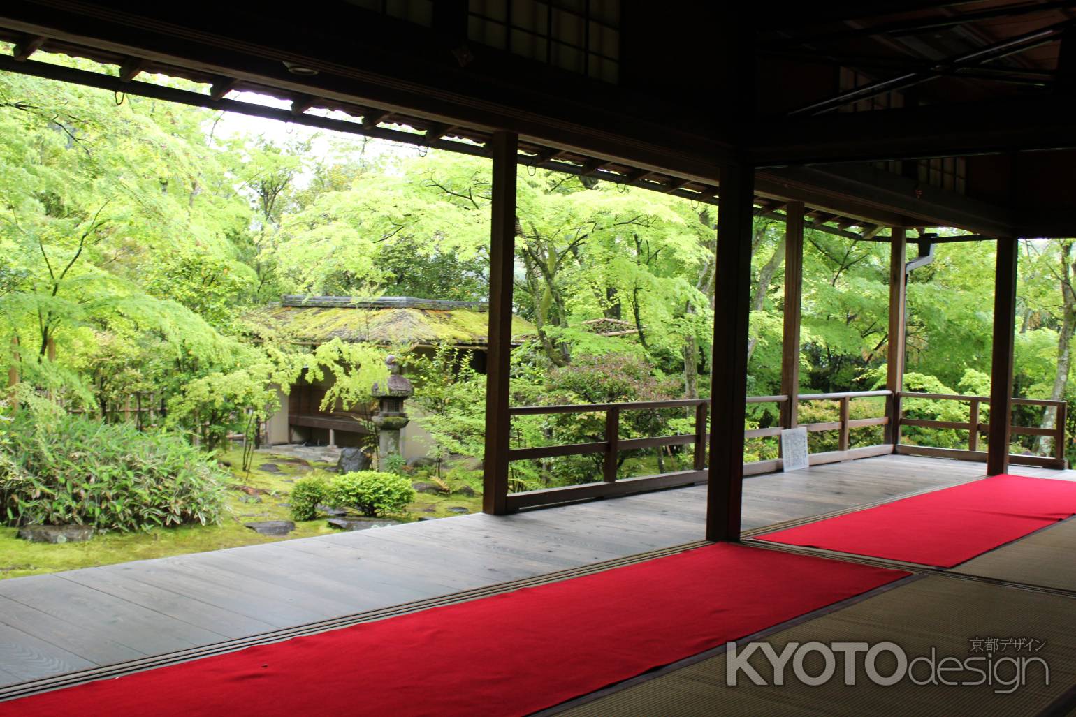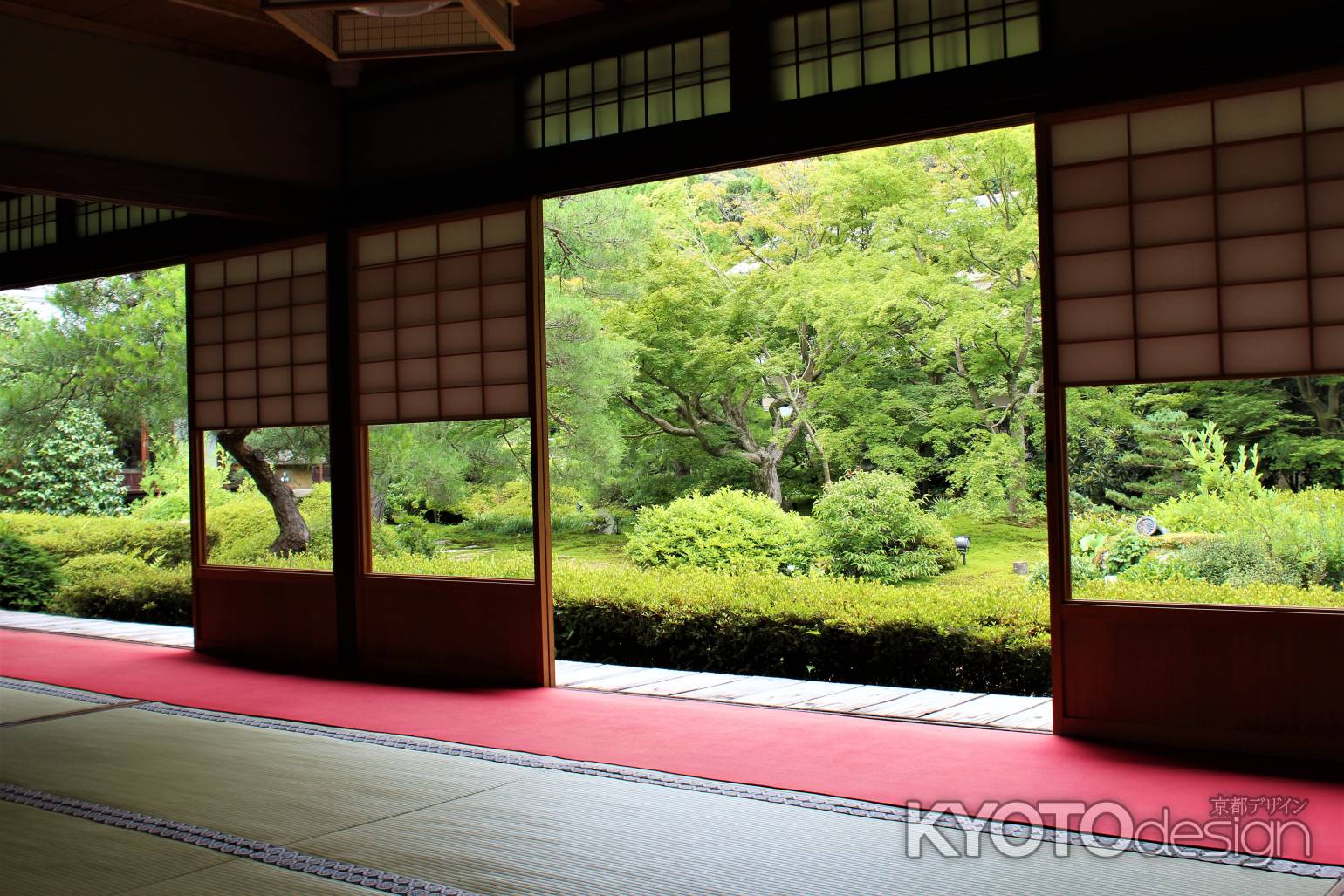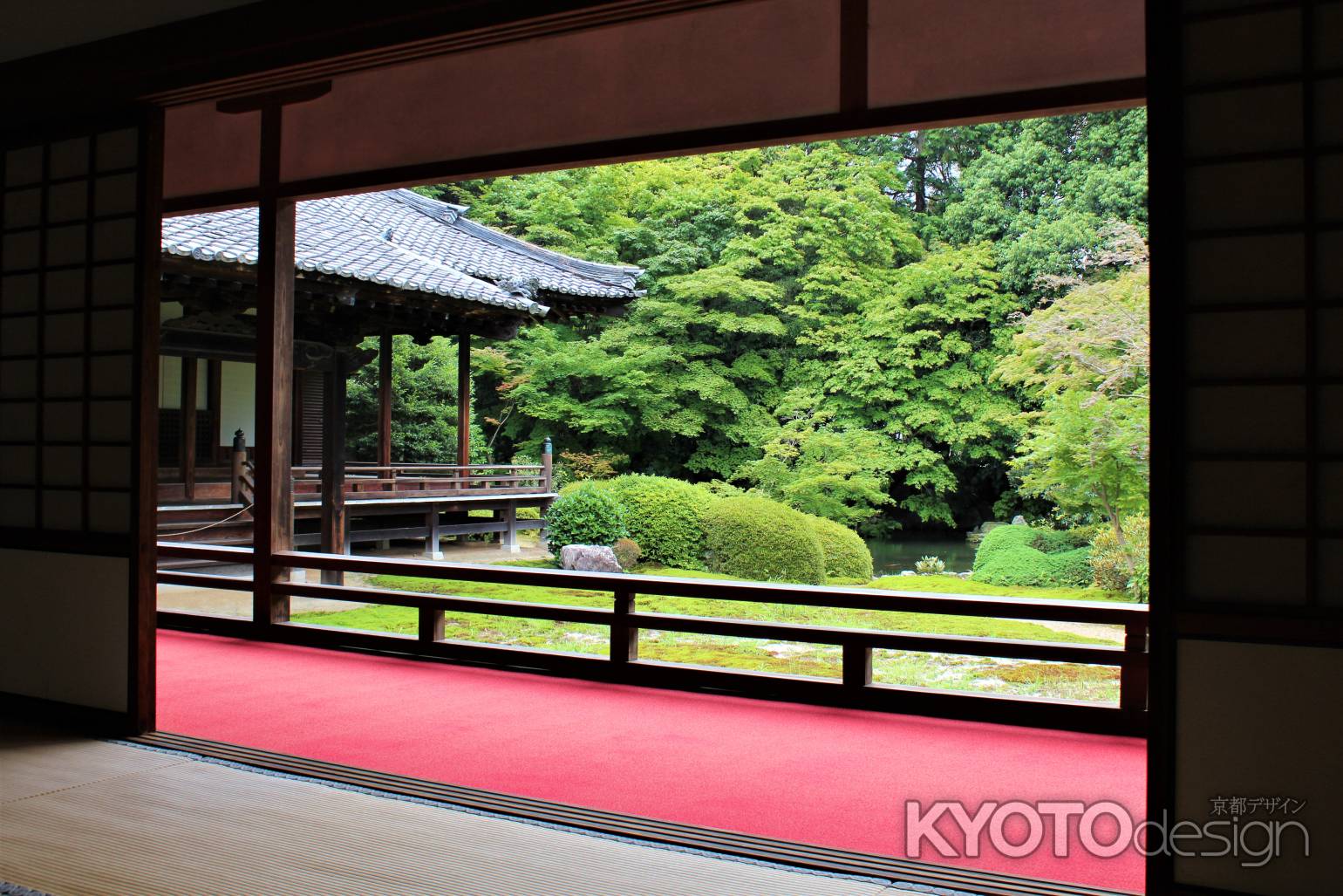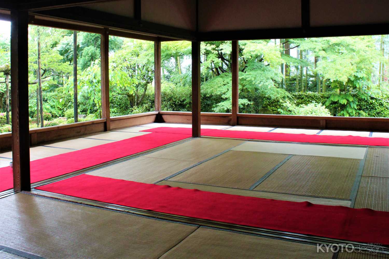 泉涌寺別院だが、別格本山という高い格式を持っている。悟りの窓、しきしの窓、走り大黒天など院内は見どころがたくさんあるが、写経道場としてもよく知られている。庭園前の緋毛氈が美しく、いろんなところでお抹茶がいただける。