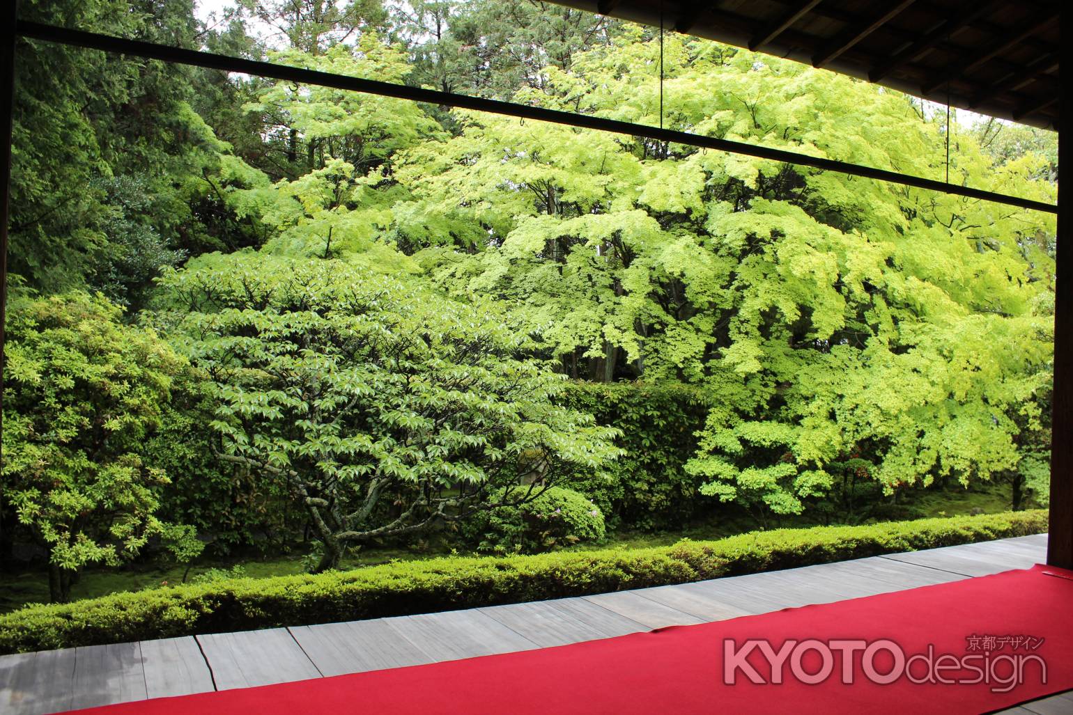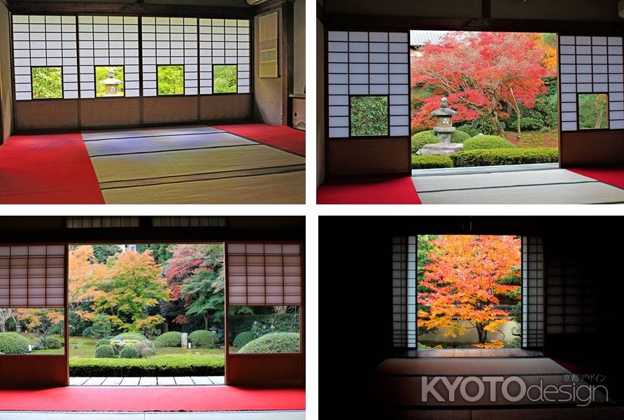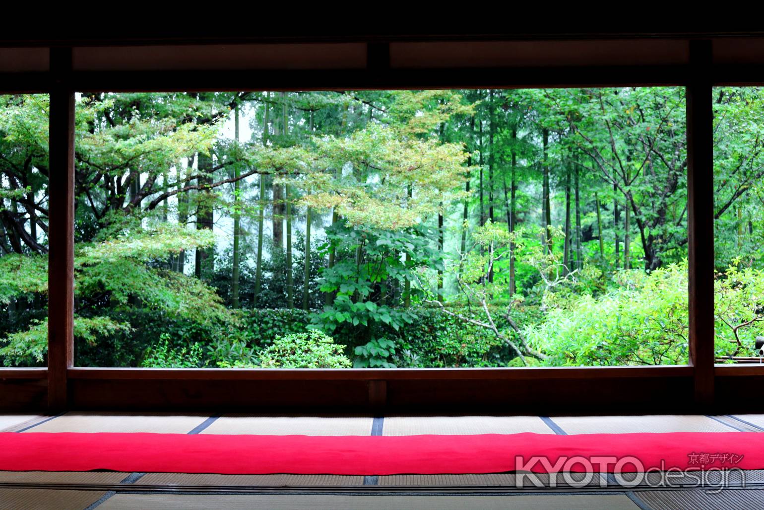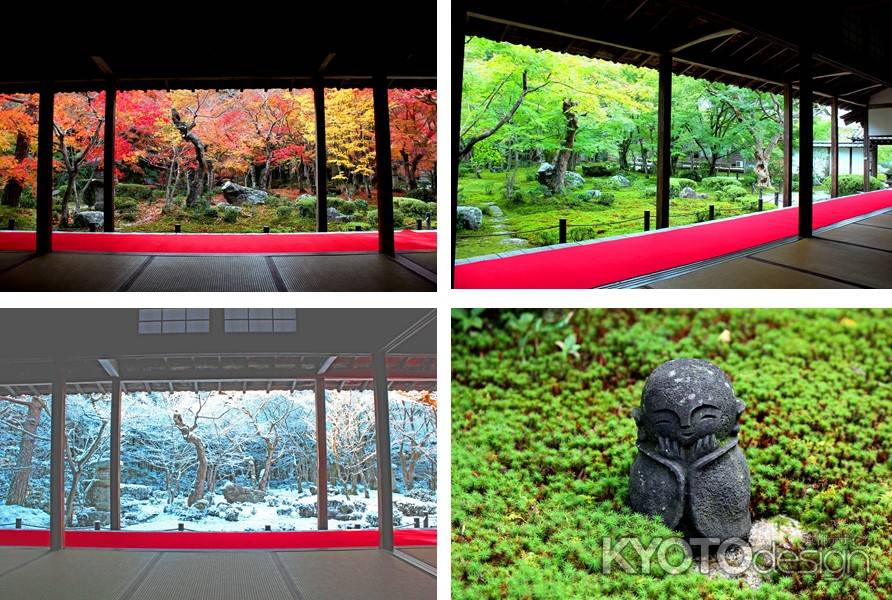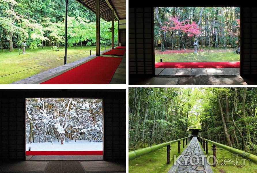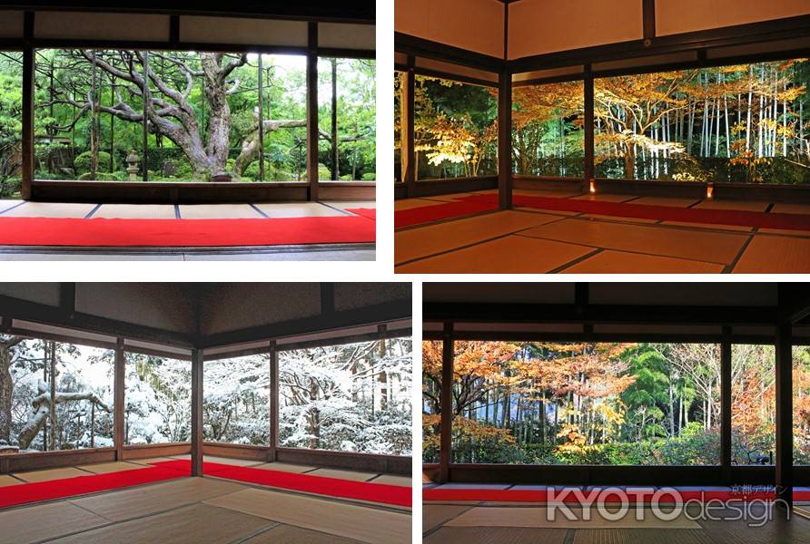 京都の代表的な額縁庭園。あまりにも知られてしまったため、一年中、拝観の人が絶えることがない。南面の樹齢700年とも言われる五葉松、西面のもみじの奥に見える竹林、どちらもすばらしい。紅葉と雪の時が特別。最近は折々にライトアップも行われる。