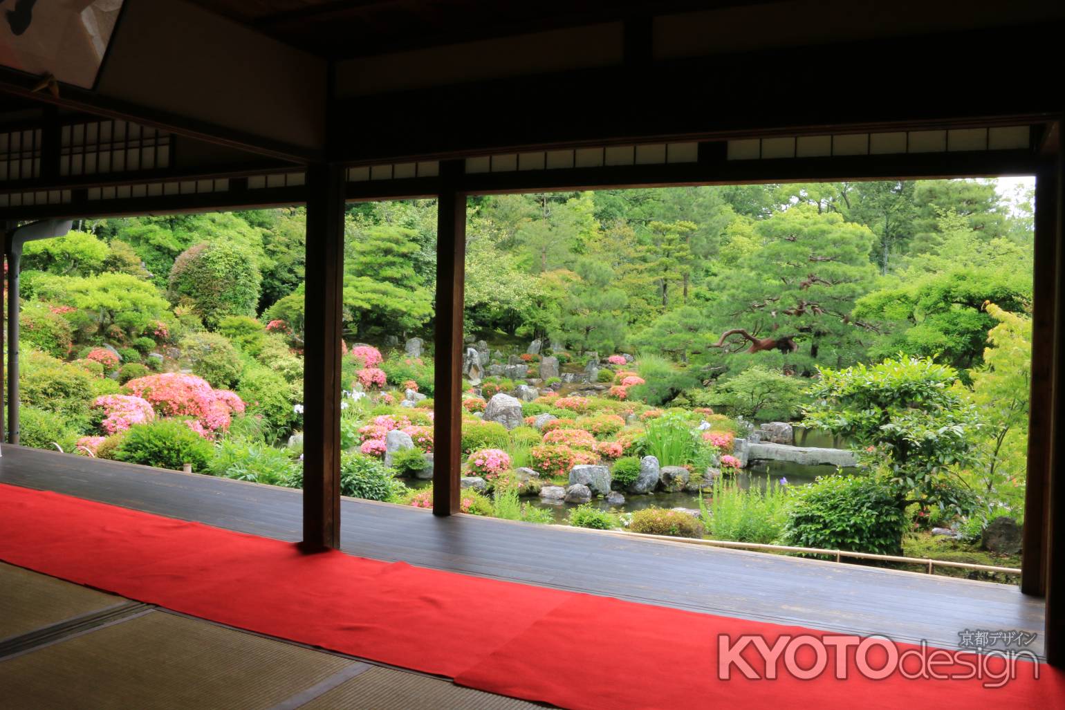 夢窓疎石の作庭と伝えられるお庭に面してきれいに緋毛氈がひかれている。本寺は、かつて別院等持寺で、本寺等持寺が消失したため本寺になり、その後等持院と呼ばれるようになった。等持寺は、3文字それぞれに寺の字が入り、尊氏の強い思いがしのばれる。かつては衣笠山を借景としていたが、高い建物で遮られたため、現在は奥に高木が植えられている。