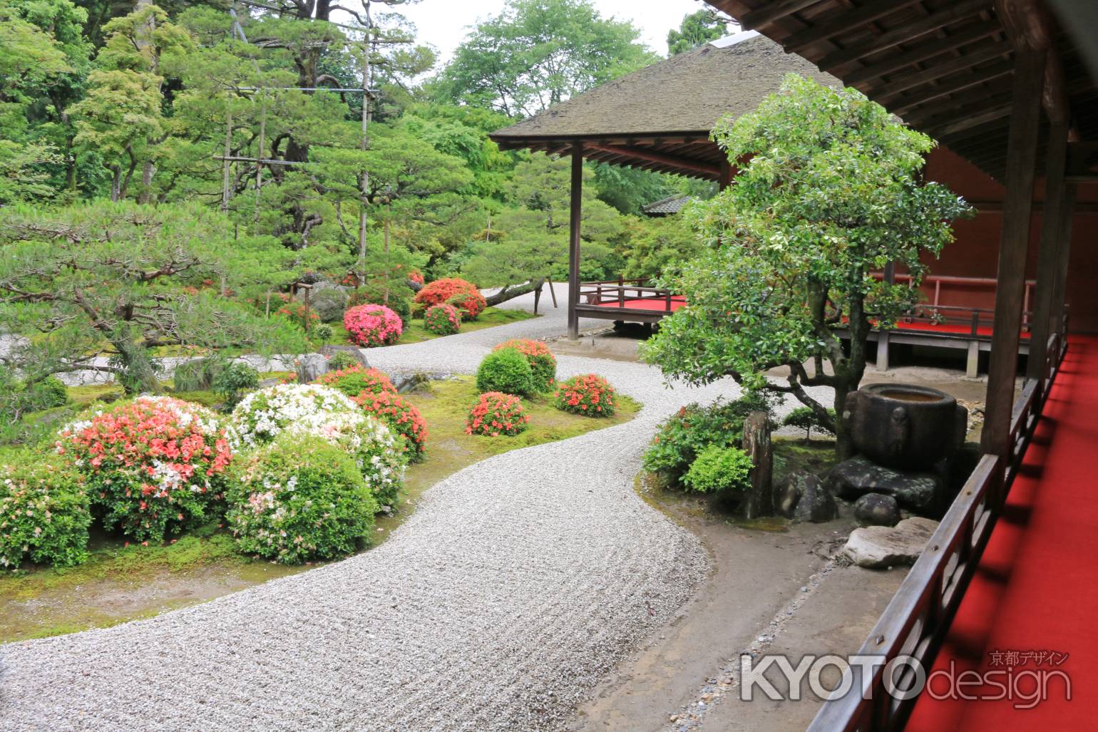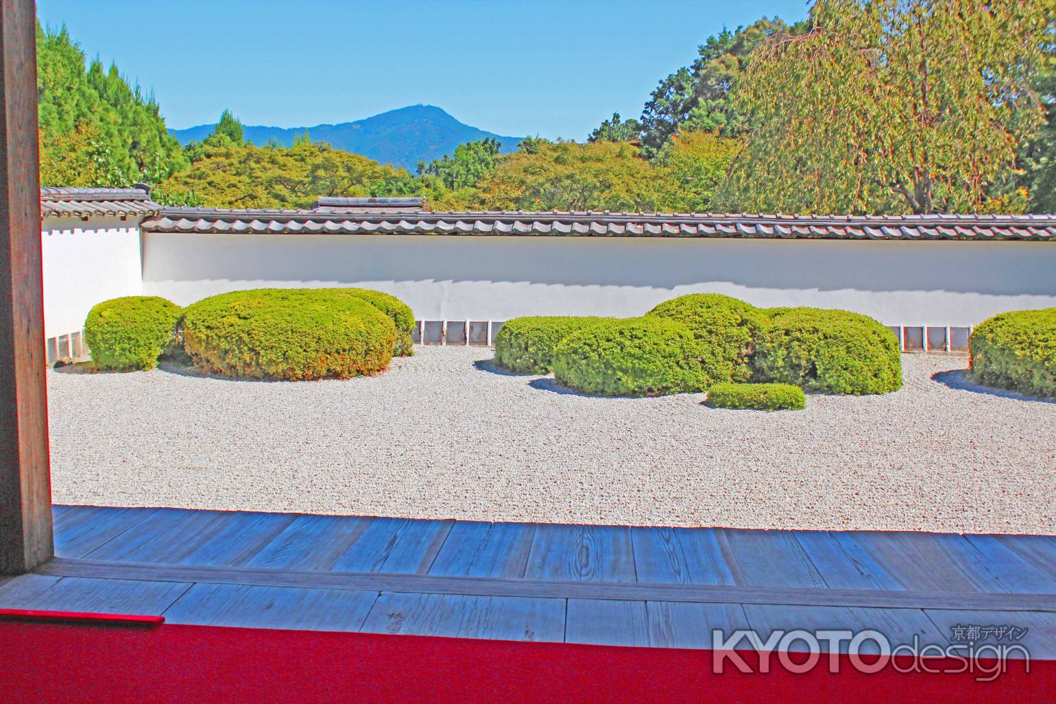 本堂前の枯山水の庭園は、小堀遠州の作庭と伝えられている。白壁ごしに遠く比叡山を借景としており、晴れた日に、くっきりと見える比叡山は、とても趣がある。庭も、白砂とサツキの刈り込みだけで作られており、そのシンプルさが多くの思いを浮かばせる。