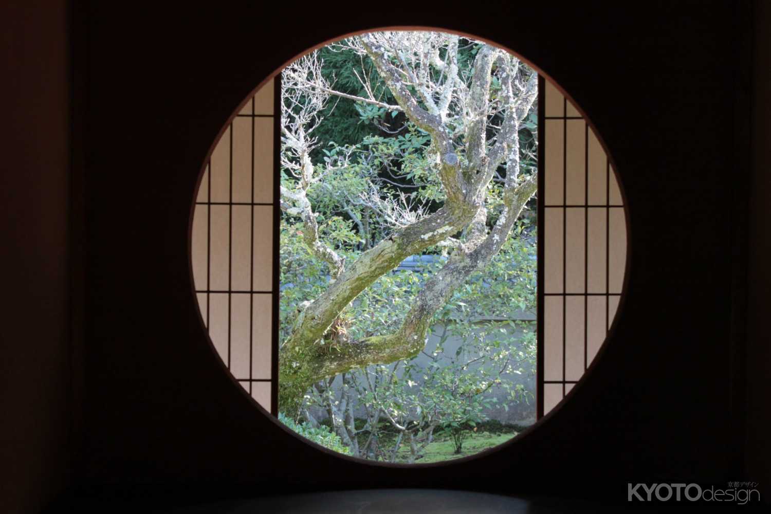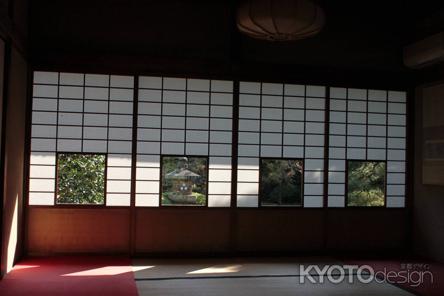 左から椿・灯篭・楓・松と色紙窓から見えます。
