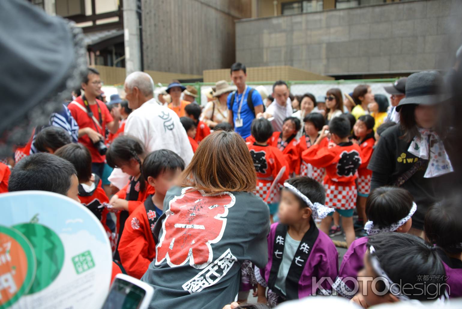 船鉾の近くの岩戸山の曳き初めには近くの小学校や幼稚園から小さな子供たちも参加しており、元気いっぱいに綱を引いていました。