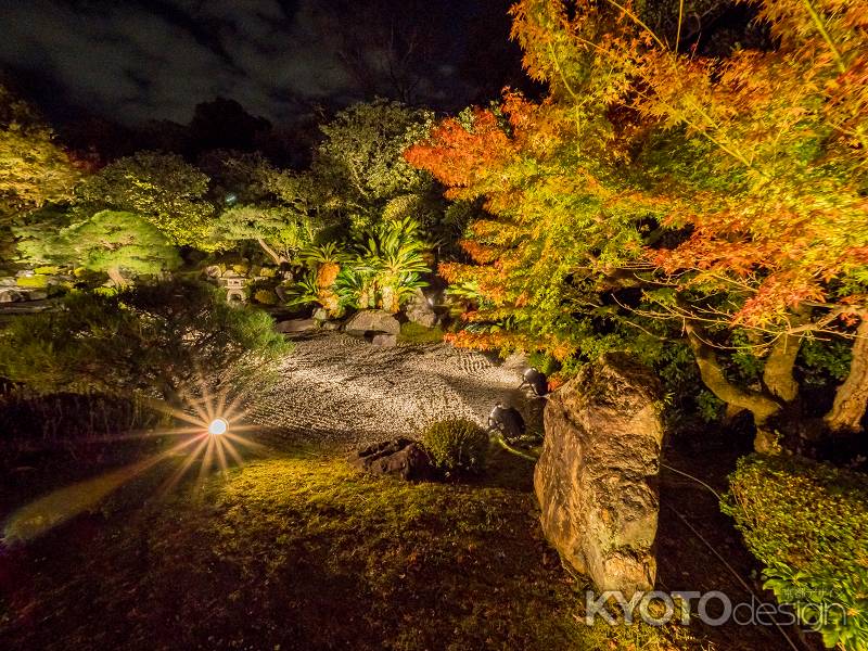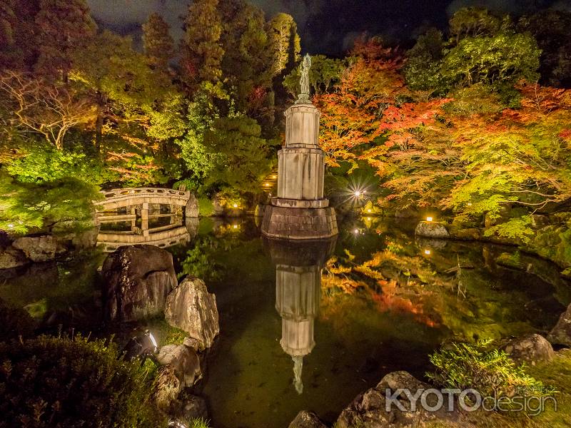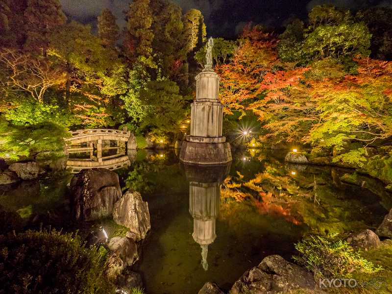 知恩院境内につくられた日本庭園です。ここでライトアップされた紅葉は本当に息をのむ美しさです。池に建つ観音菩薩像とライトアップされた紅葉が見事に融合されています。是非ともカメラをもって写真におさめたい景観ですね。