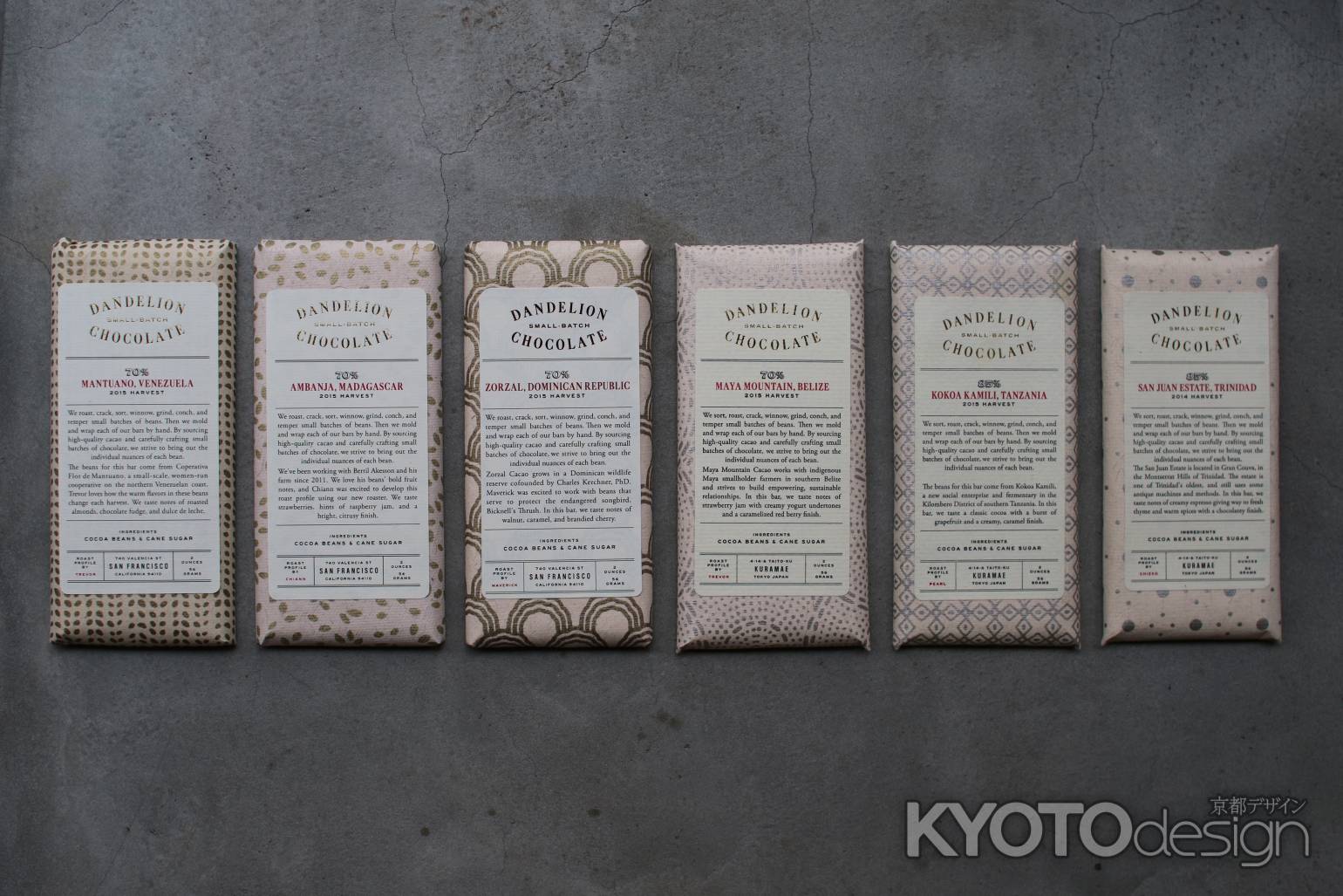 Bean to Barブームによって様々な手法が展開される中、ダンデライオン・チョコレートの製品はカカオ本来の味を純粋に味わうために、シングルオリジンカカオ豆とオーガニックのケインシュガーのみを使用しています。また、カカオバターや乳製品を添加せずにつくられていることが特徴です。さらに豆の選別、焙煎、摩砕、テンパリング、成形、包装といった過程のすべてを手作業で行っているそうです。