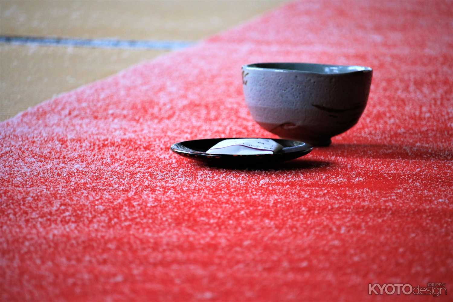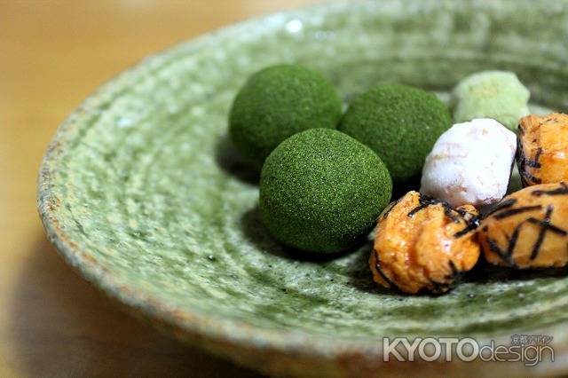 京都でも老舗の金谷正廣さんの真盛豆。豊臣秀吉が、茶会で「茶味に適す」と称賛し、細川幽斎が「苔のむす豆」にたとえたと伝えられています。丹波産黒豆に大豆粉を幾重にも重ね青のりをかけた味は、お茶にぴったりの風雅な味わいです。上京区にお店はありますが、京都駅内おみやげやさんの何か所かでも、真盛豆を売っています。また、無鄰菴で抹茶をいただくときにも添えられています。写真の丸い緑のものが真盛豆です。