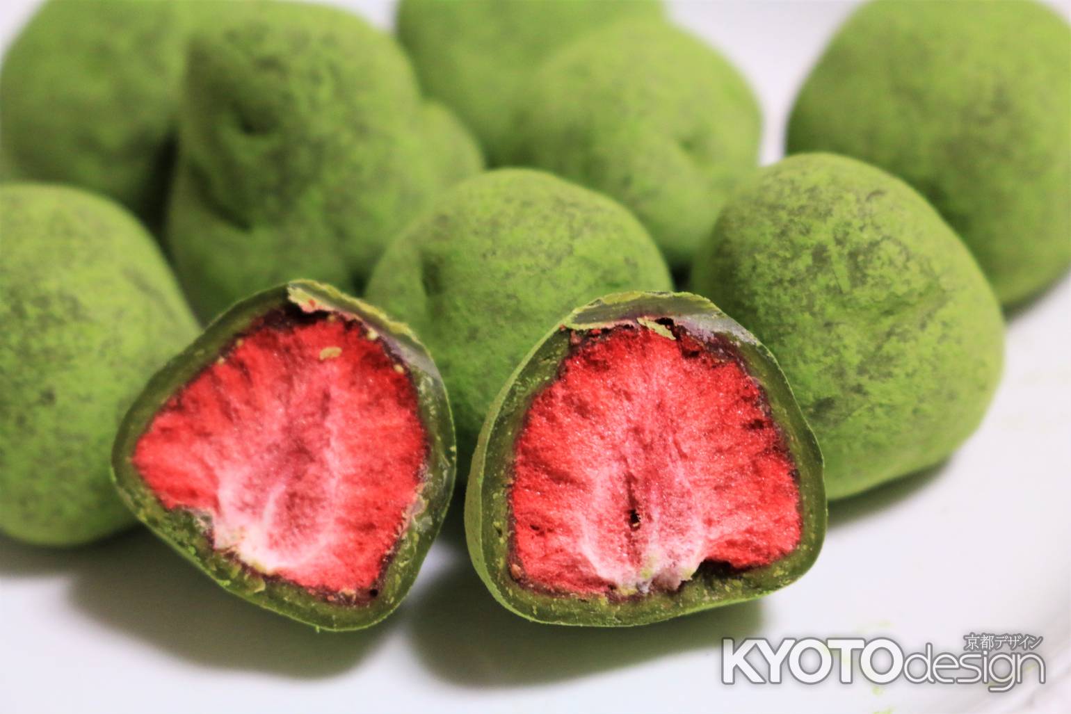 宇治、伊藤久右衛門さんのお茶苺さん。まるまるの苺を抹茶のホワイトチョコレートでくるんだものです。保冷が必須ですが、食べる前に少し常温に置いておいたほうが、舌触りがやわらかくなり美味しく感じます。抹茶苺大福もあります。冬季限定でこの冬から販売始めました。お店は、宇治本店、宇治駅前店、平等院店、京都駅前店、その他京都駅に3か所販売しているところや嵐山などにも伊藤久右衛門さんの商品を扱っていますが、なかなかないので京都駅前店での扱いだけかもしれません。